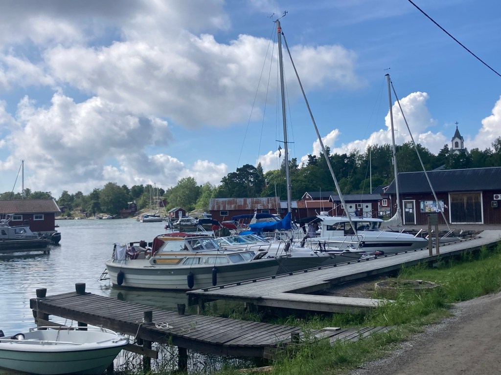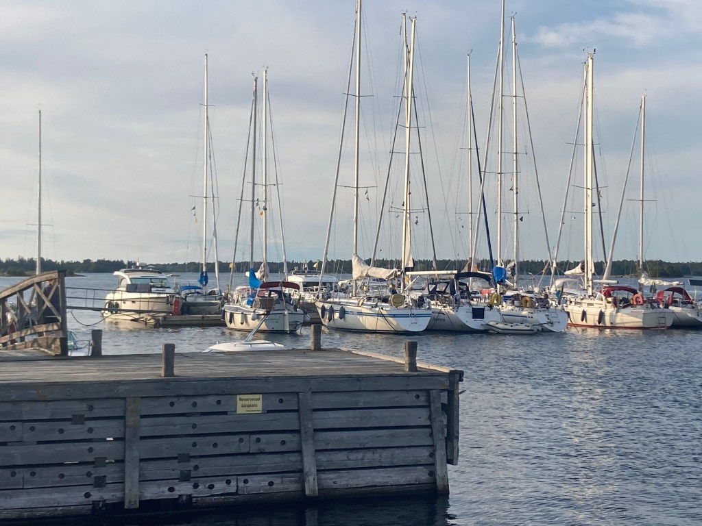 Fejan har systemet med moringlinor, vilket är lite jobbigt. Vi lyckades ”parkera” utan problem. När övriga i Sörmlsndseskadern kom hade hamnen fyllts med fler båtar. Det blev lite stökigt innan alla var på plats.