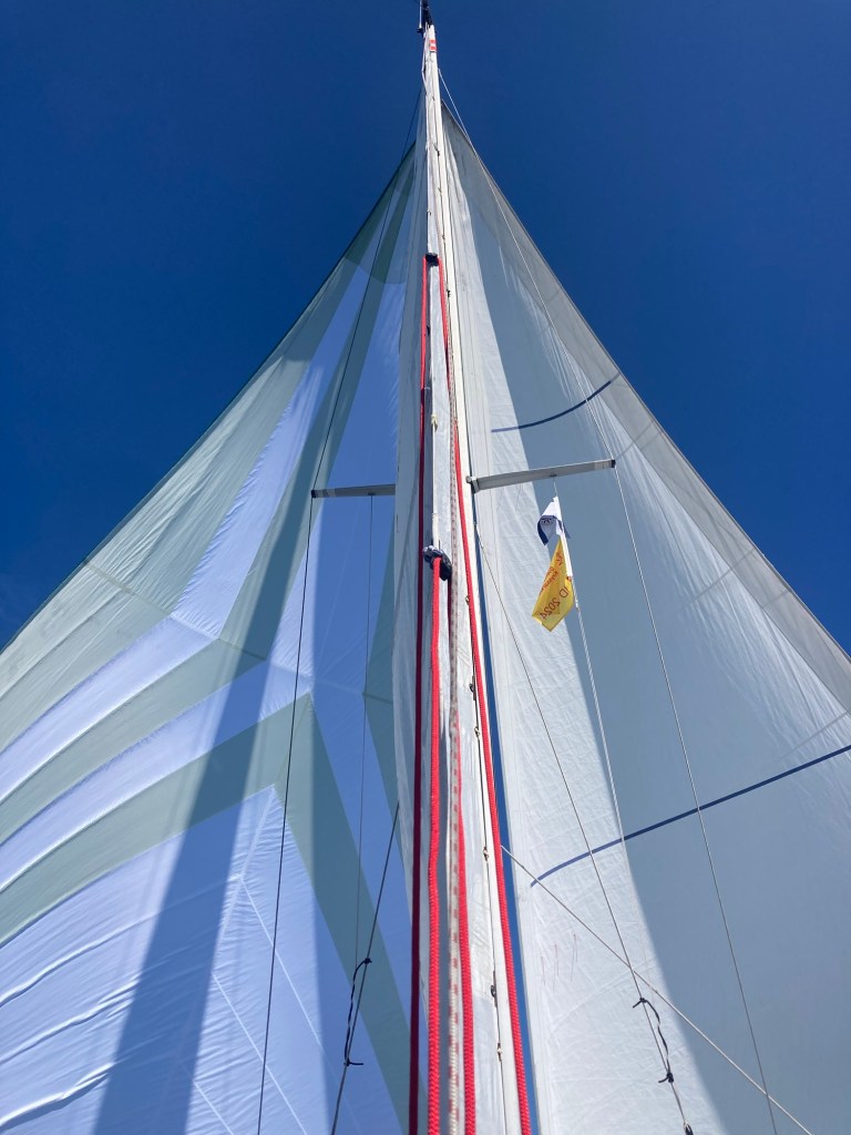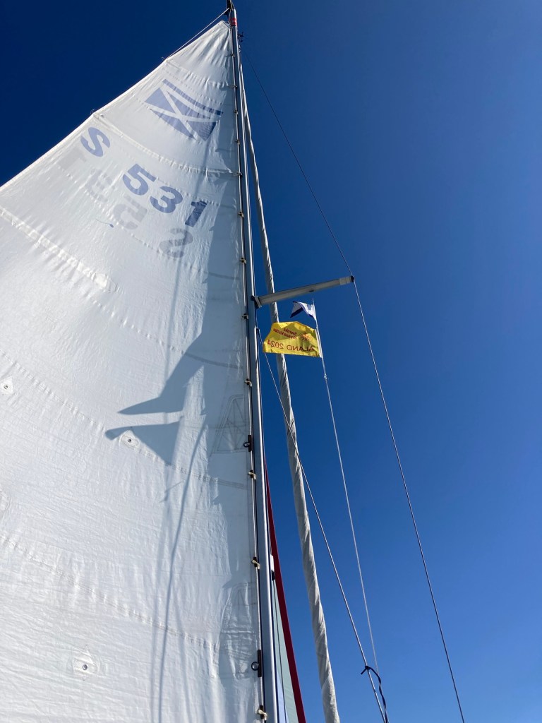 När farleden vek av mot norr blev det plattläns. Storen skotades så den inte tog någon vind. Genuan rullades ut på motsatta sidan mot gennakern och spirades maximalt.