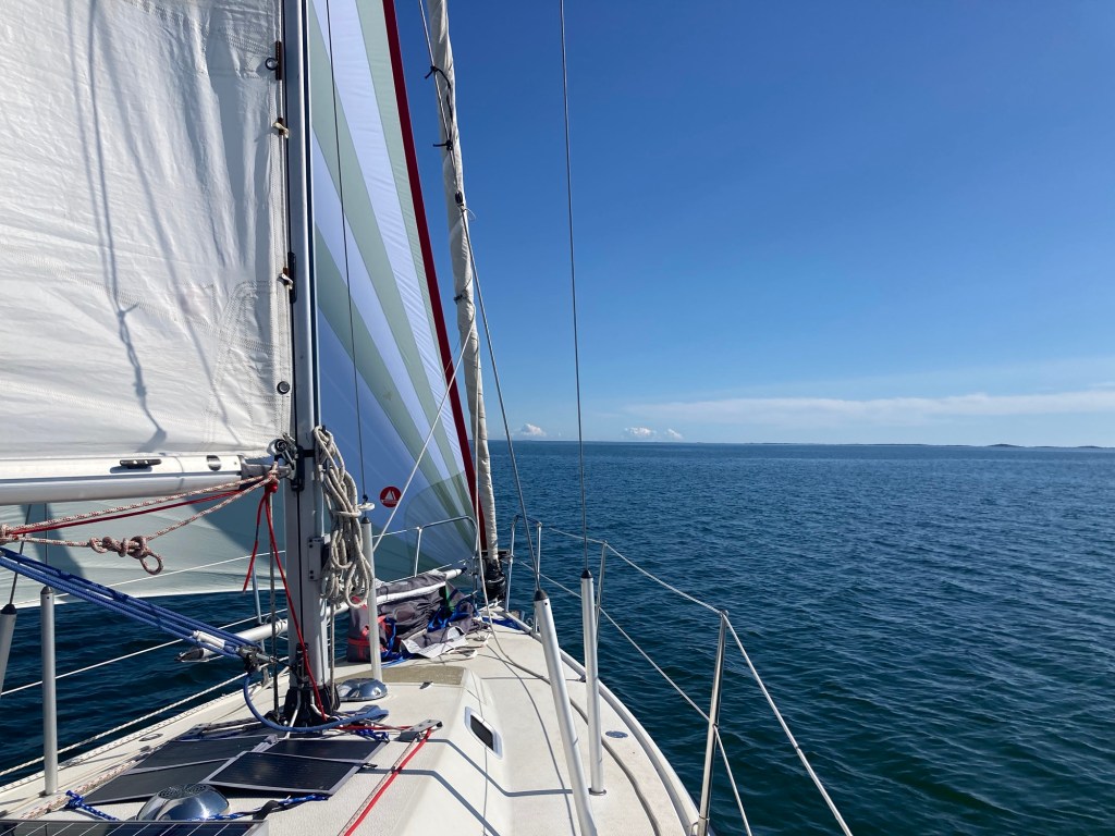 Vi fick gå för motor förbi Möja-landet pga för svag vind. Sedan stängde vi motorn och hissade stor och gennaker. Några knop gjorde vi.