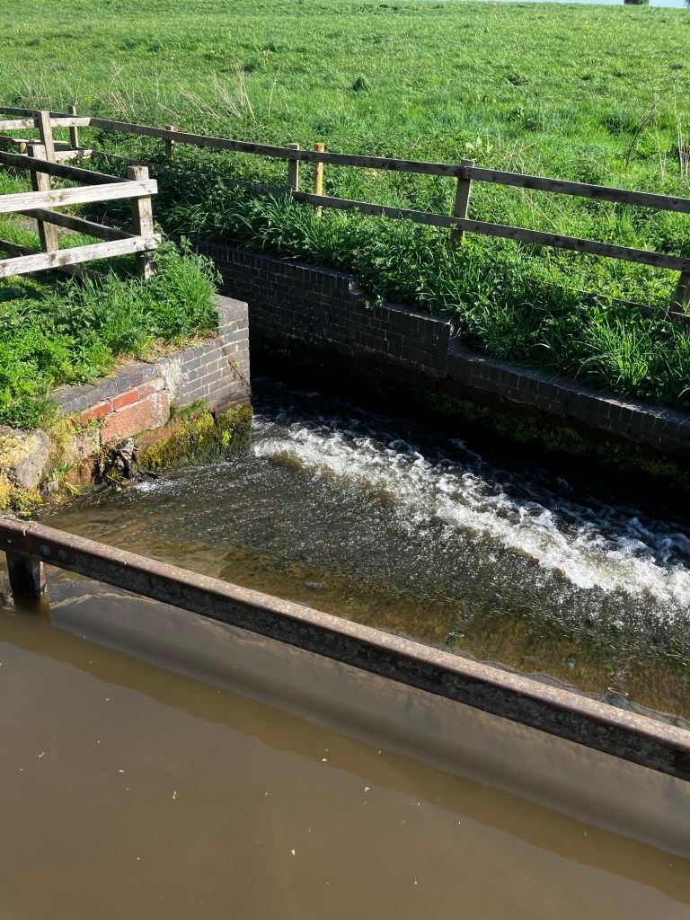 Om det är för mycket vatten i kanalen släpper man (breddar) vattnet förbi slussen i en liten bäckfåra. Man får passa sig så inte båten fångas av strömmen och hamnar snett.