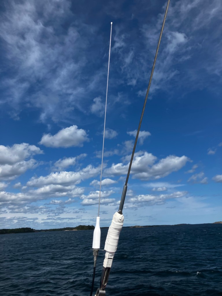 Jag har lärt mig att AIS:en måste vara påslagen för att jag ska kunna höras längre sträckor med VHF:en. AIS:en har en inbyggd splitter som behöver vara strömförsörjd för att VHF:en ska fungera. Jag har en reservanten monterad på akterstaget. Dit kan jag koppla AIS:en eller VHF:en. Räckvidden blir betydligt sämre. AIS:en når då bara 10 sjömil, men det är egentligen fullt tillräckligt för att se fartyg.