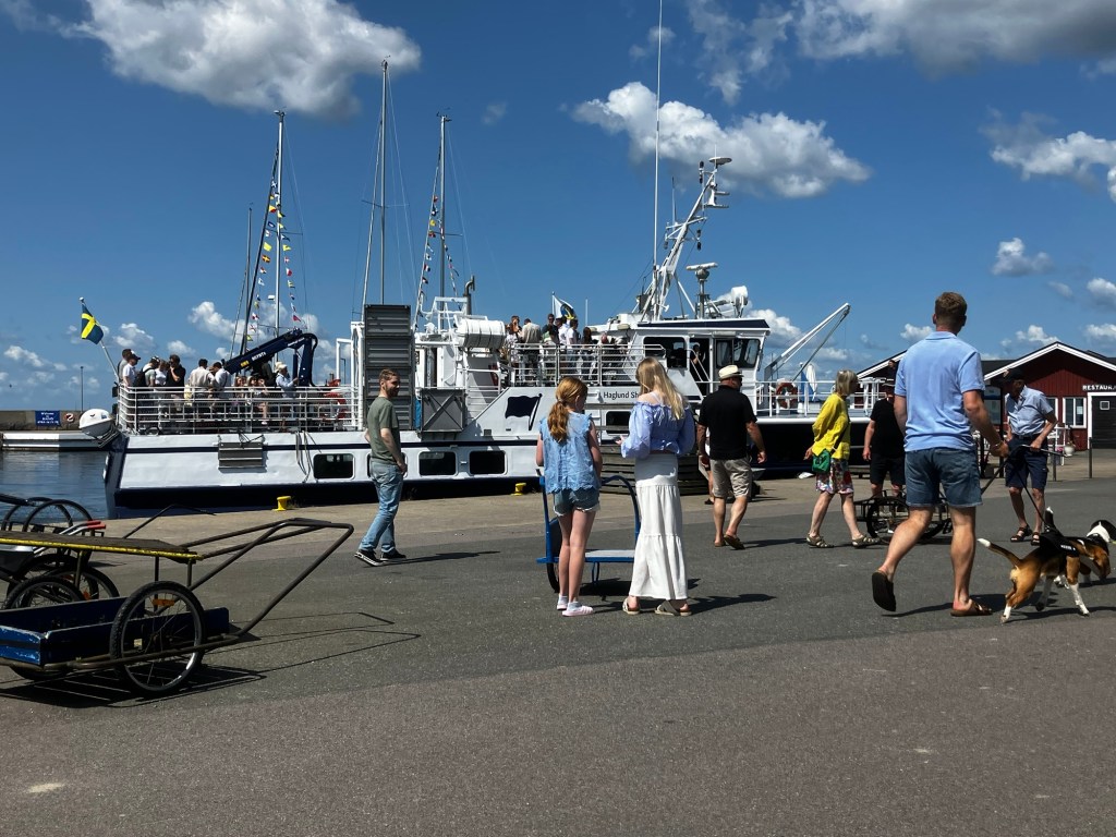 Det var många båtar i Hanö hamn. Innan solen gick ned låg det båtar i tredubbla rader längs kajen. Turbåten gick täta turer och släppte av gästerna som välkomnades på kajen av stugägarna. Ofta med en kärra i släptåg för allt bagage.