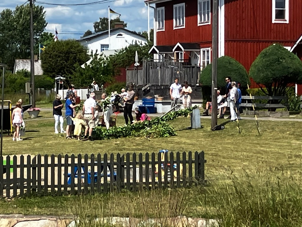 Arbetet med midsommarstången tog en bra stund. Men sen blev det dans runt stången och tävlingar för alla barnen.