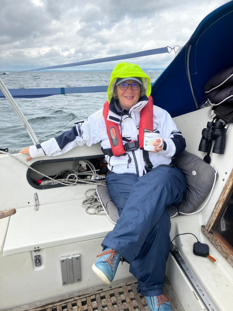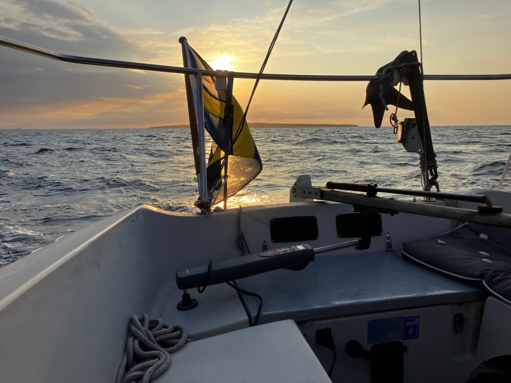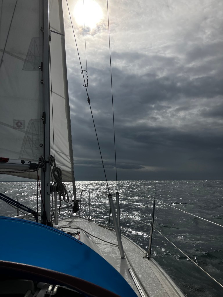 Vågorna minskade betydligt men vinden hade vridit emot. Vi körde motor en timme till. Vinden ökade men vred samtidigt till vår fördel så vi kunde rulla ut genuan och segla relativt bekvämt.