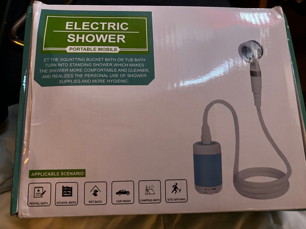 För en ganska billig peng köpte jag hem den batteridrivna duschen . Vi tar upp en hink sjövatten, kokar ett par liter dricksvatten som hälls i hinken så tempen blir lagom. Sen trycker man igång pumpen och stoppar den i hinken. Och vips har man en dusch.