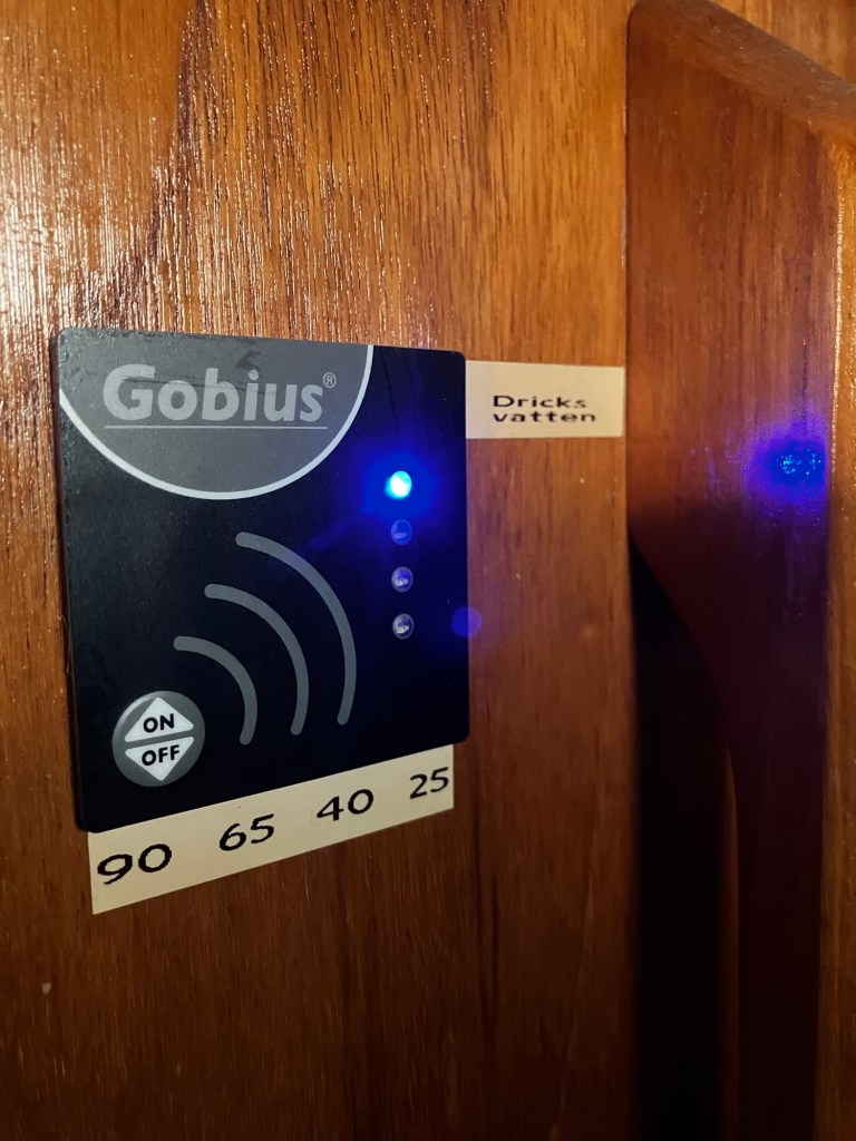 Vattentanken är på 90 liter. Den har vi pumpat och manuellt mätt hur många liter som finns mellan respektive indikation. På bilden ser man uppgiften om hur många liter vatten det finns kvar när respektive diod börjar lysa. 25 liter i tanken när sista dioden lyser alltså.