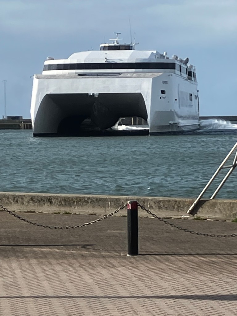I dag var vindprognosen 10 i medelvind och 20 i byarna. Då tyckte vi det var läge att låta PerMonick få ledigt en dag. I stället tog vi snabbfärjan till Rønne. Det går på 1 timme 20 minuter. Men då kommer katamaranen upp i 40 knop vid bra väder.