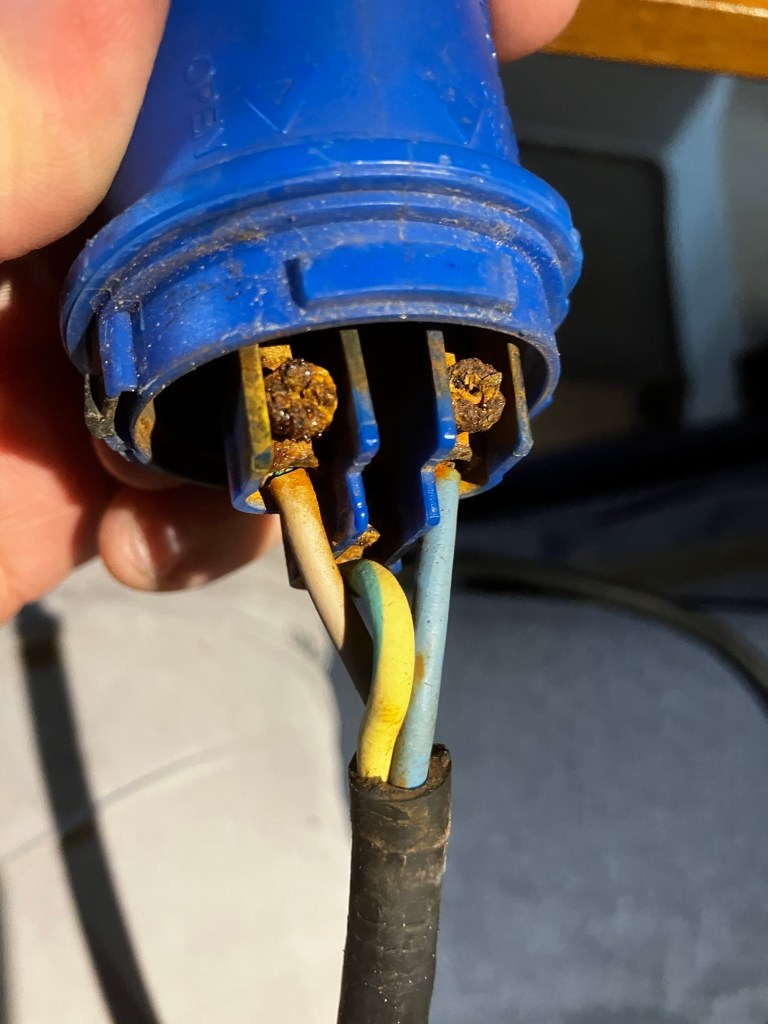 ”Hemma” igen upptäckte vi att kabeln till landströmmen hade trillat ner mellan infästningen till en av bommarna. Det är stora krafter där dyningen rullar in så kabeln blev helt platt. När den skadade delen skulle kapas visade det sig att CEE-stickproppen inte lät sig monteras på nytt. Det blir att skaffa en ny.