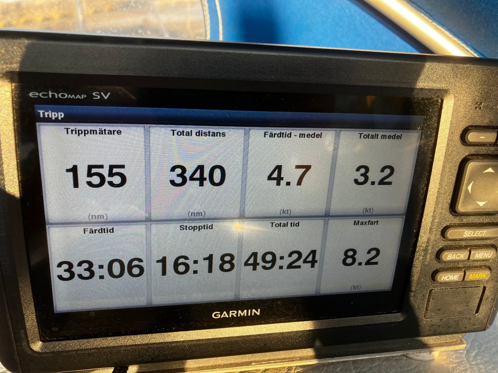 Vid flera tillfällen gick farten över 8 knop. Plottern, som har en viss dämpning (snitt 10 sekunder) loggade som mest 8,2 knop. Det är en rekordfart, om man bortser från de surfar jag gjorde med båten för några år sedan (utanför Sandhammaren).