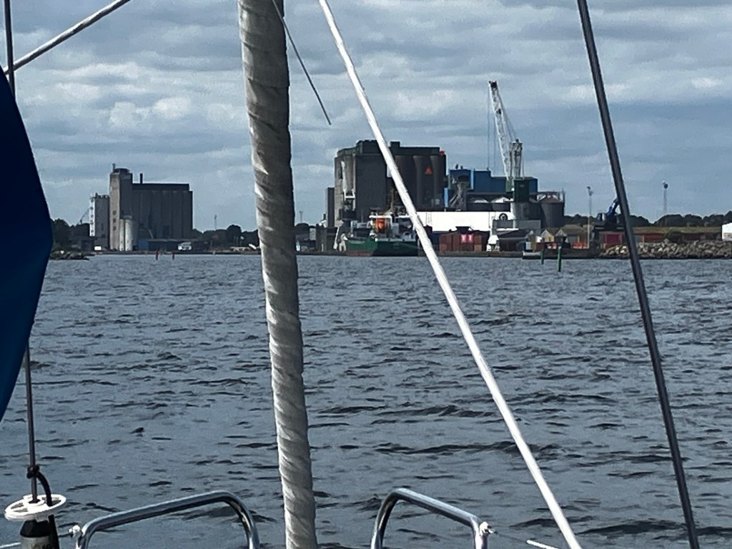 Eftersom det var så stora vågor utanför inloppet smet vi in innanför de stora vågbrytarna – där färjorna håller till. Där fick vi plattvatten och kunde hissa storen utan problem.