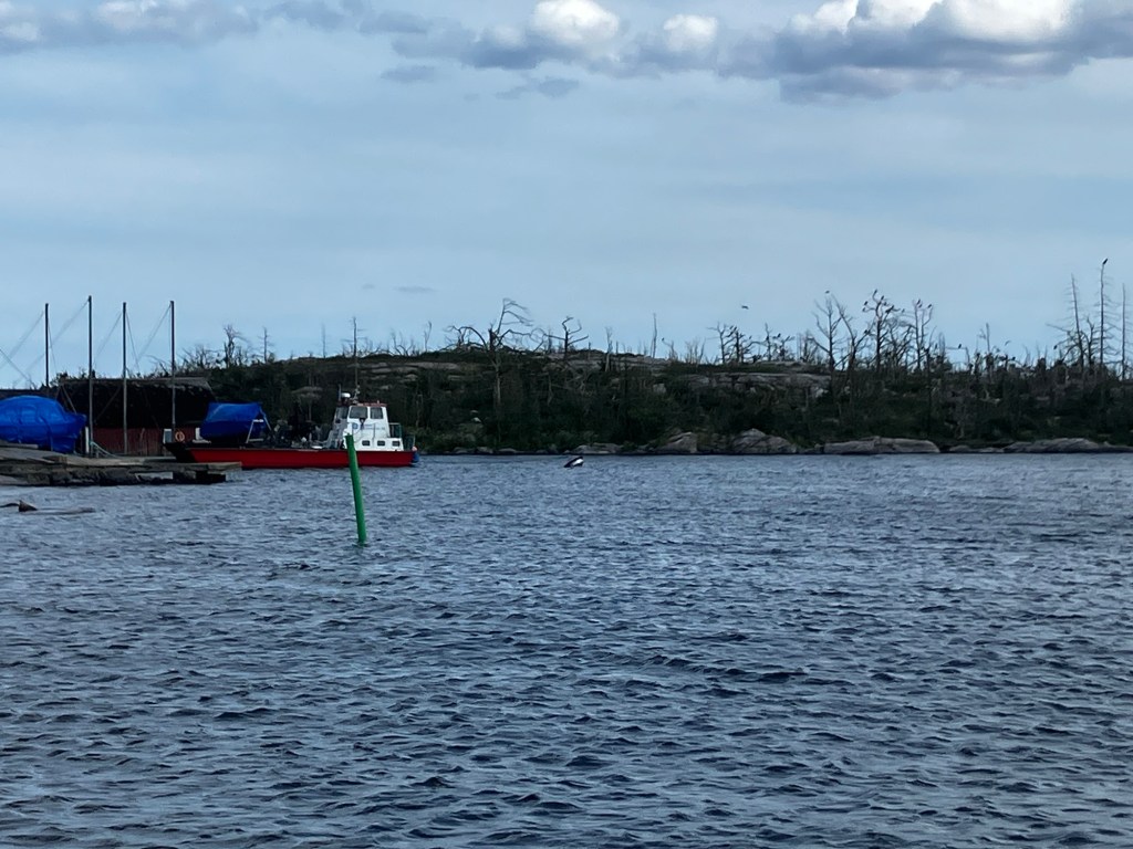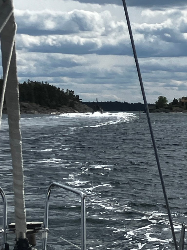 Den militär båt som körde om oss i farleden drog upp kraftiga svall när farten var 7 knop. När båten passerat oss ökades farten och den försvann i en sky av vatten och vågor som spolade rent på näraliggande skär. Vi har sett rätt många kamouflagemålade båtar de här dagarna…