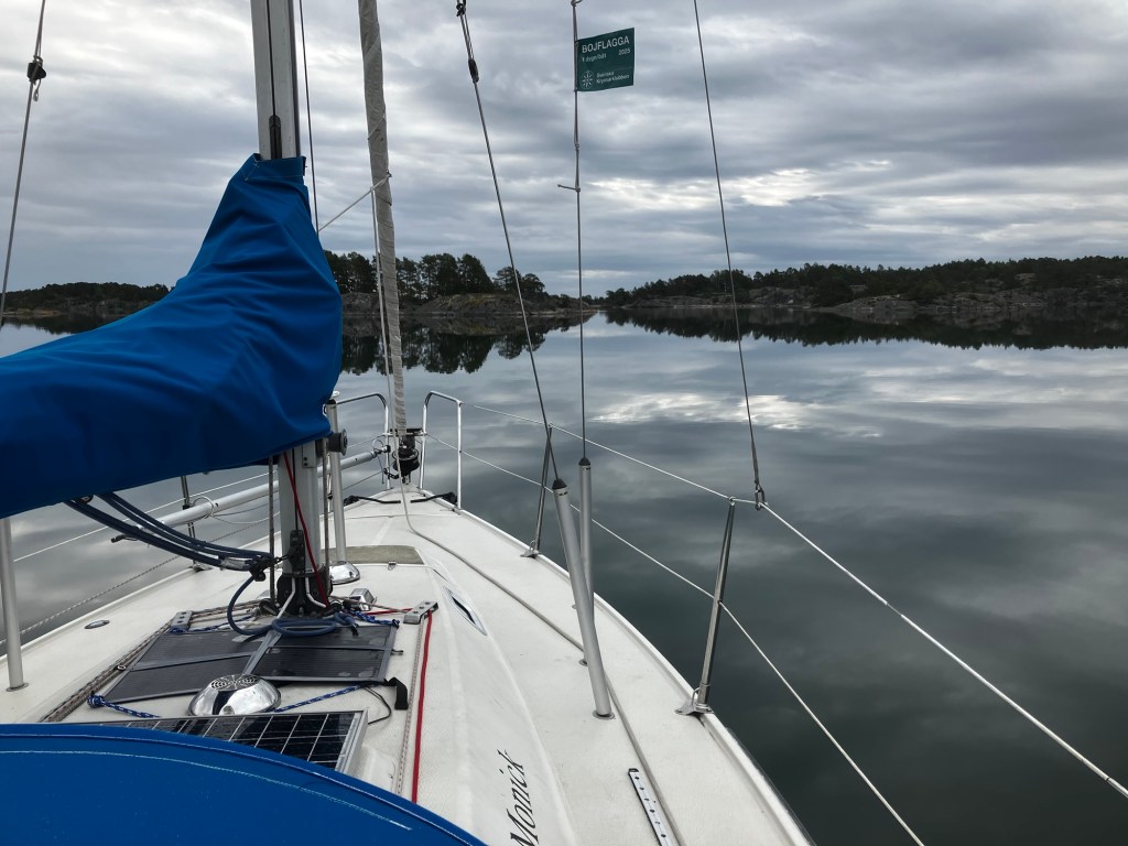 På några ställen gick farleden i en riktning så vi kunde rulla ut genuan. Med bara 1/3-del av genuan utrullad ökade farten från 4,5 knop till 6,5.