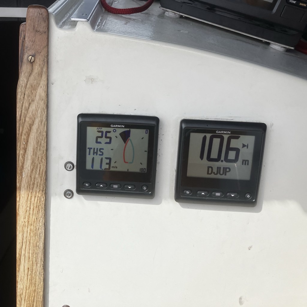Vindinstrumentet visar upplevd vindvinkeln (43 grader) både i siffror och grafiskt. På den grafiska bilden ser man även ett enskilt streck. Det är den vindvinkel det skulle vara om båten inte rörde sig framåt. För att räkna ut detta tar instrumenten in data från logg-givaren. Även vindstyrkan är korrigerad mht den fart båten har genom vattnet.