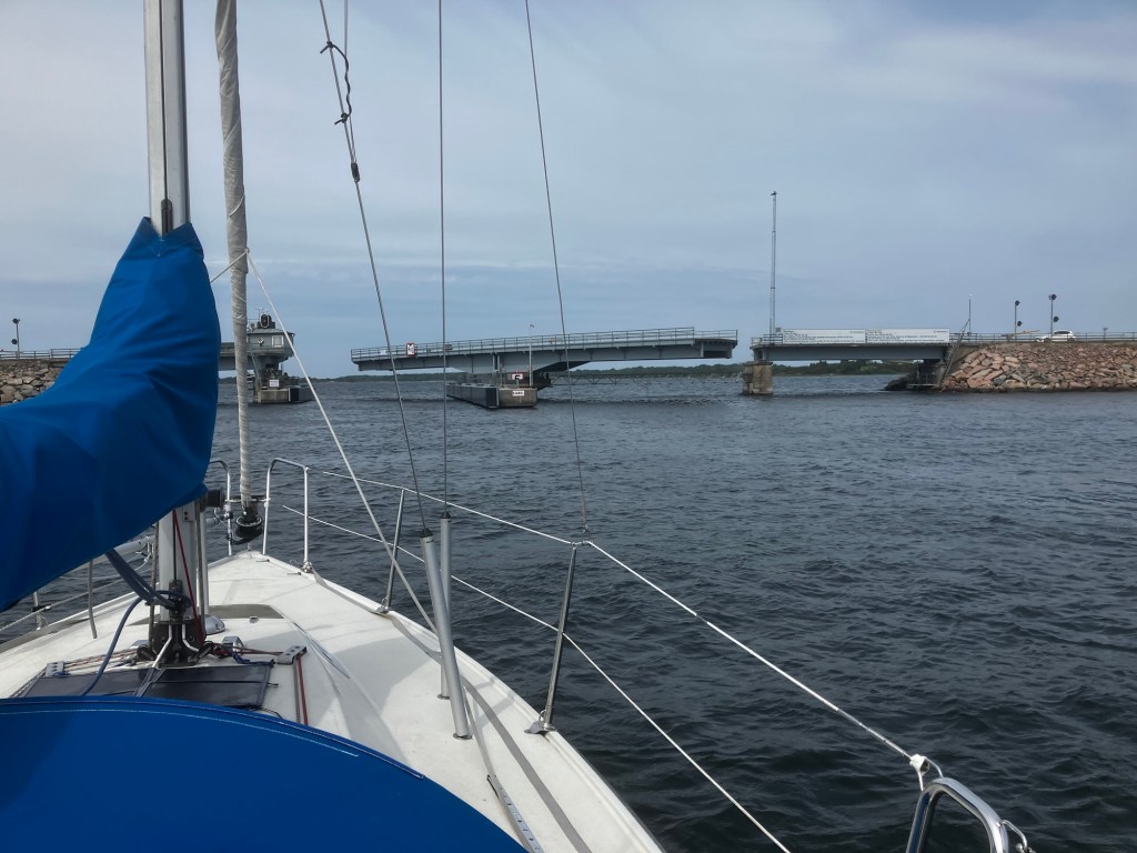Motvinden ökade ytterligare och farten minskade, så vi fick dra på ordentligt för att hinna i tid. När vi kom fram fälldes bommarna, bron öppnades och vi körde igenom.