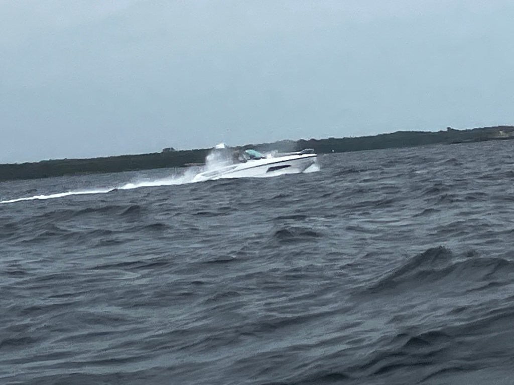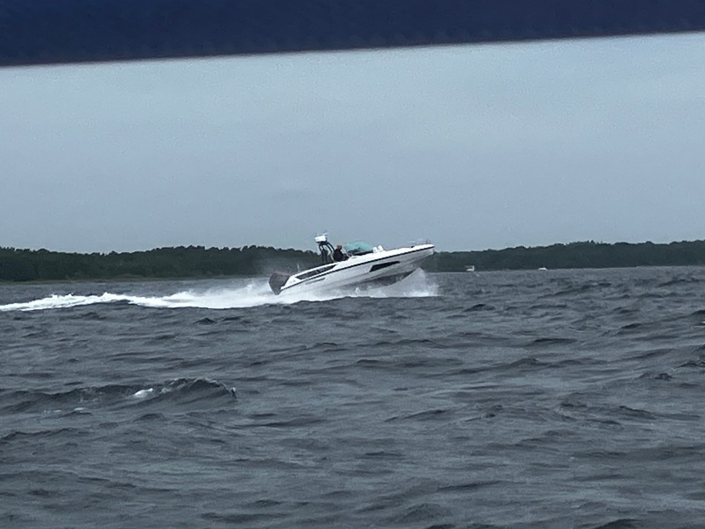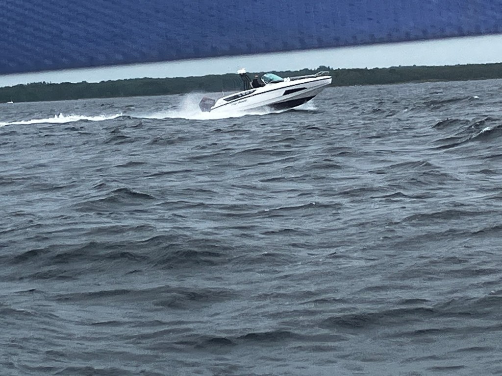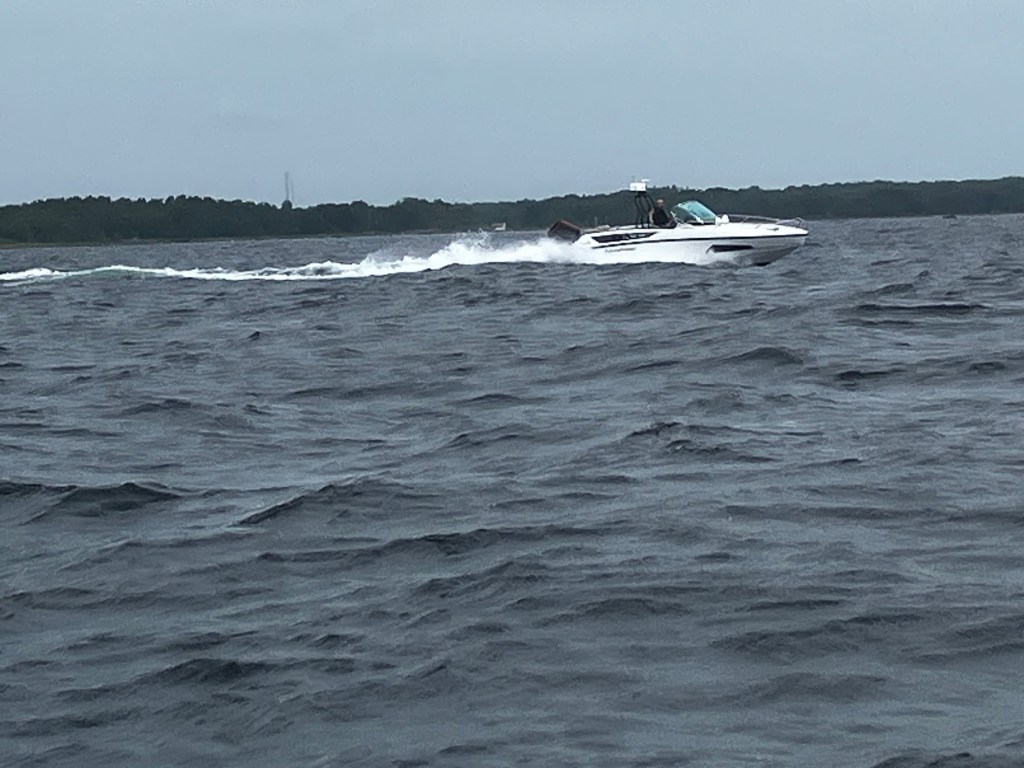 Strax efter bron åker man ut på Hanöbukten. Vinden har fritt fram att skapa vågor ända från Bornholm, vilket vi snabbt erfor. Det var en rejäl dyning som kom rullande från SV samtidigt som kortare men ganska höga vågor från den vind som nu rev i från väst. Det blev en ganska skumpig framfart utanför Blekinges kust. Efter 7 sjömil gick farleden in bland grynnor och öar så vi fick lite sjölä.