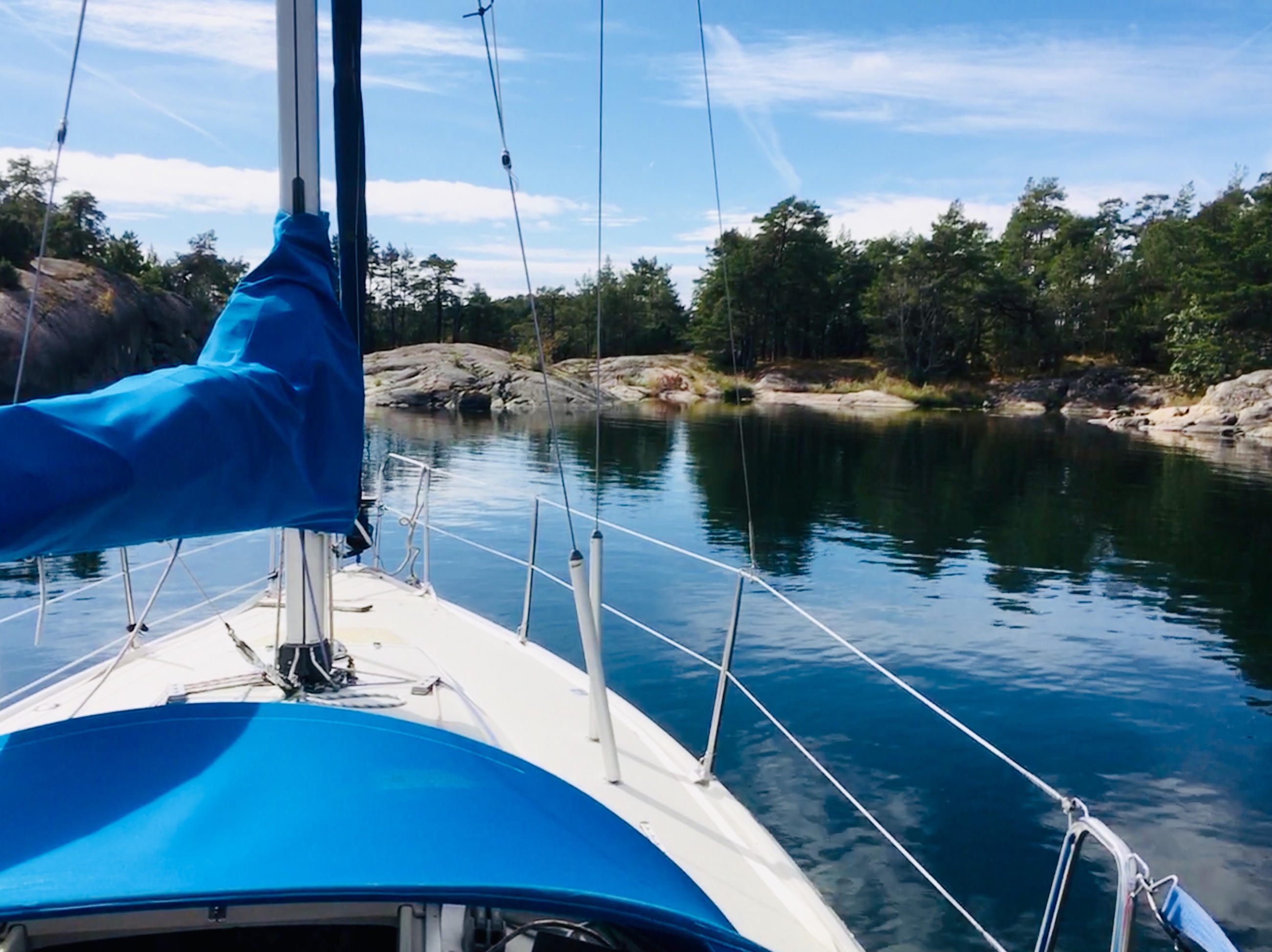 Efter en ganska guppig segling över Bråviken i 6-8 m/s gick vi till favoritviken på Lundarna. Men där låg redan fem (!) båtar, så vi följde plan B och lade oss på svaj i en angränsande vik.