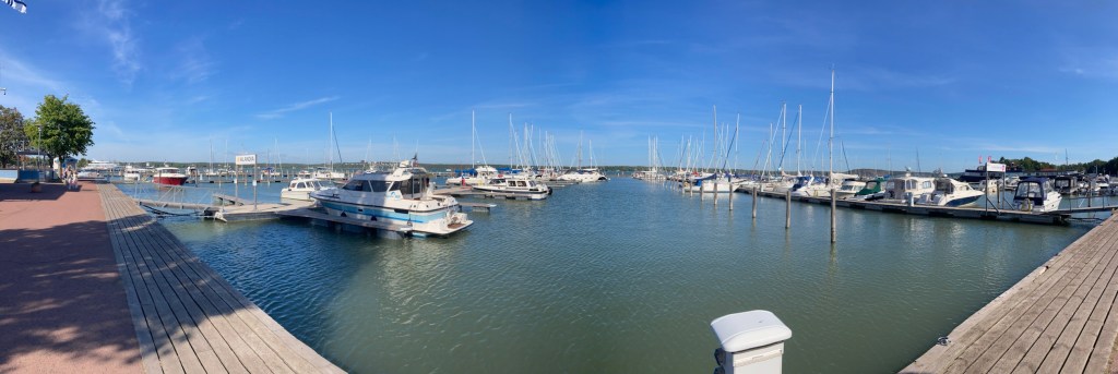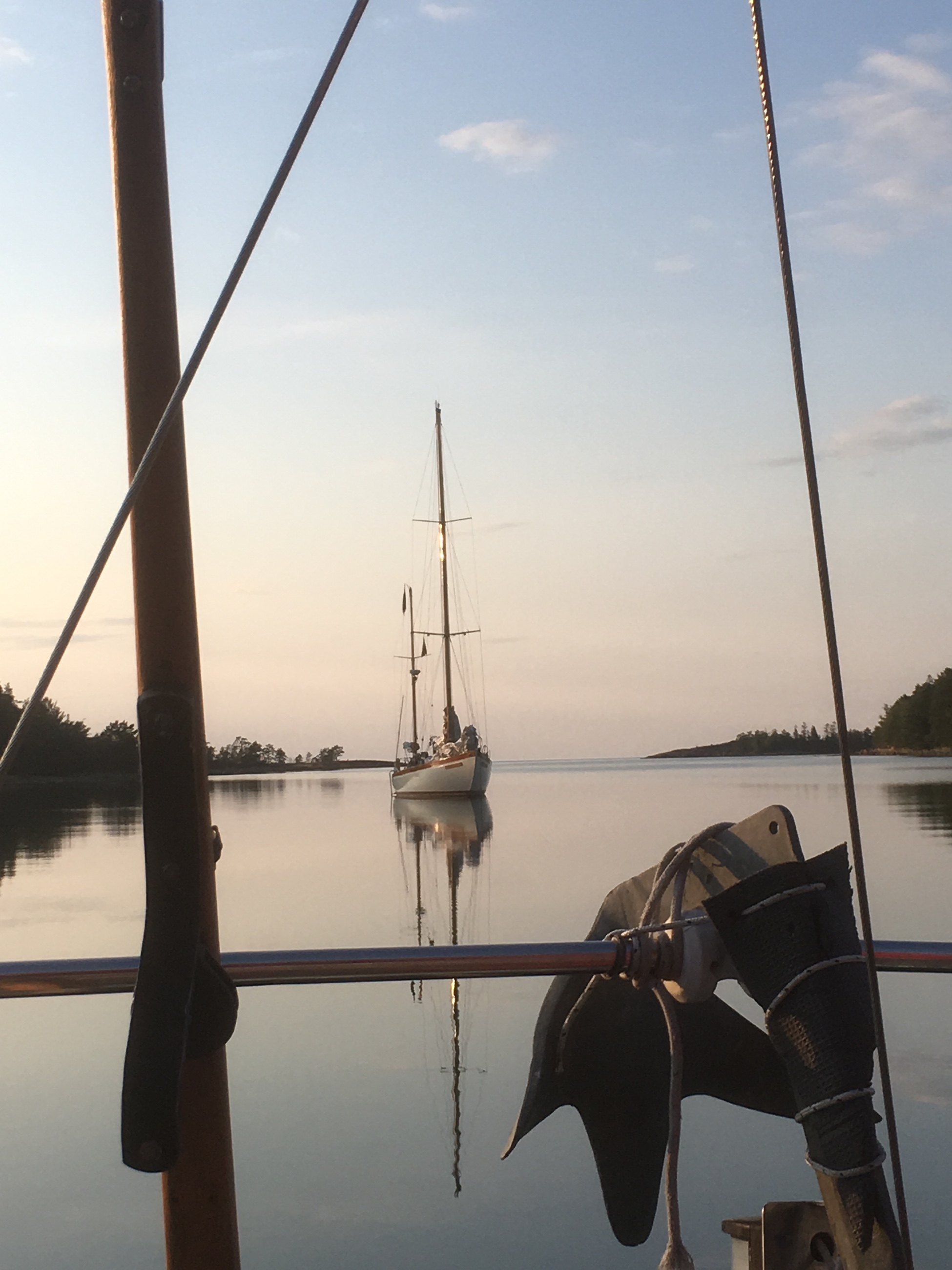 Den tilltänkta gästhamnen väster om Kapellskär hade privatiserats. Vi hittade en vik ett par sjömil väster ut för vi ankrade på svaj. Ankarlanternan har slutat fungera, så ett par pannlampor får fungera som lanterna i natt.
