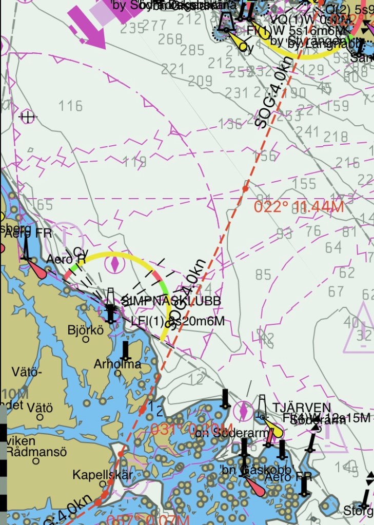 Det var ganska många lastbåtar som passerade åt norr och söder, har inte sett så många på en översegling tidigare. Min Garminplotter är duktig på att varna om det är risk för kollision respektive att visa ”grönt ljus” när mötet kommer att ske säkert. Man måste dock tänka på att den egna farten kan ändras och att fartygen kan gira.