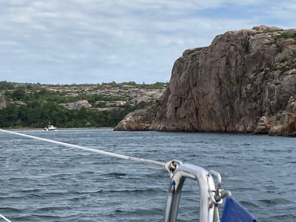 Efter en sallad till lunch lämnade vi Nynäshamn i tilltagande (mot-)vind. Vi brydde oss inte om att ta bort bomkapellet. Målet för dagen var nån vik i närheten av Dragets kanal.