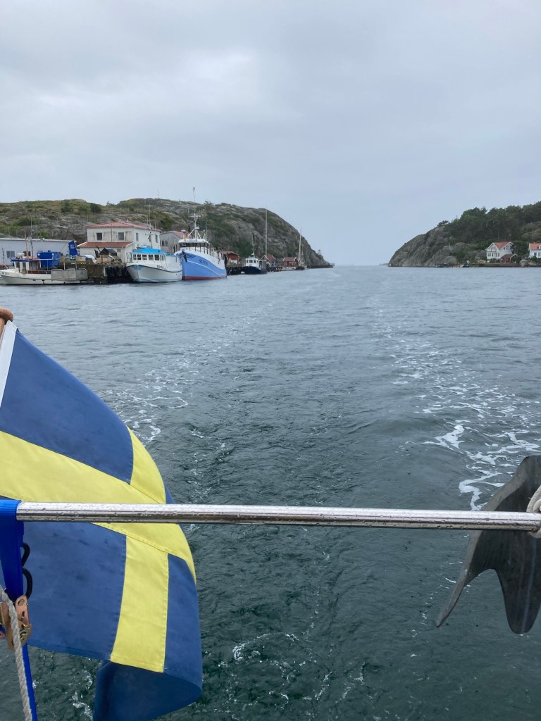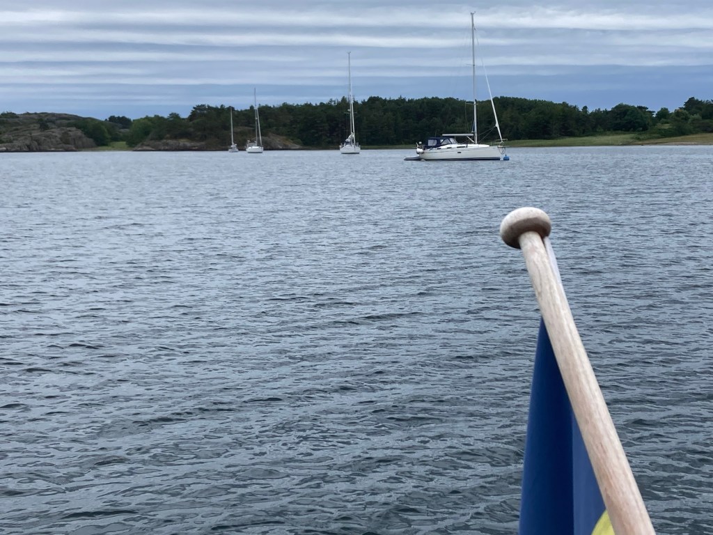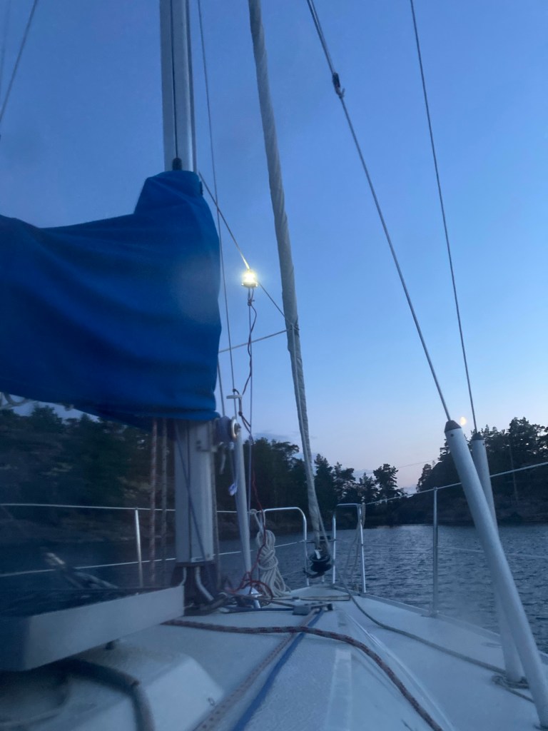 Vi lade oss på svaj i den första lilla viken. Ankarvakten är påkopplad och det är vindstilla tack vare skogen, så vi ligger säkert för natten.