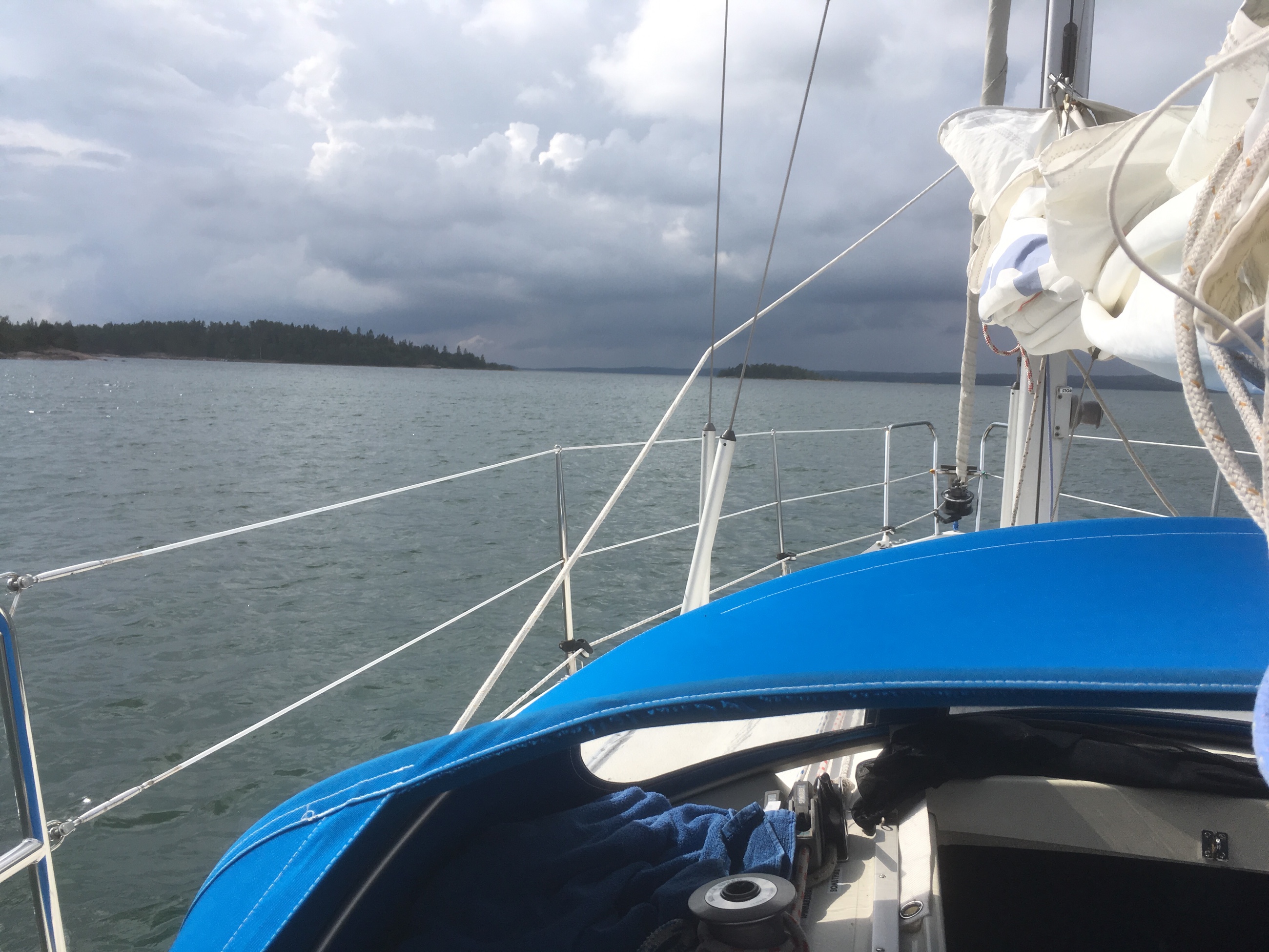 Bakom oss, över Kalmar, kom ett stort åskmoln med regn. Det drog norrut men såg ut att sakta lämna Kalmarsund. Efter en halvtimme försvann Kalmar och det mesta av fastlandet till vänster om oss i regnskyar. Vi fick en släng av regnet, så regnställen åkte på.