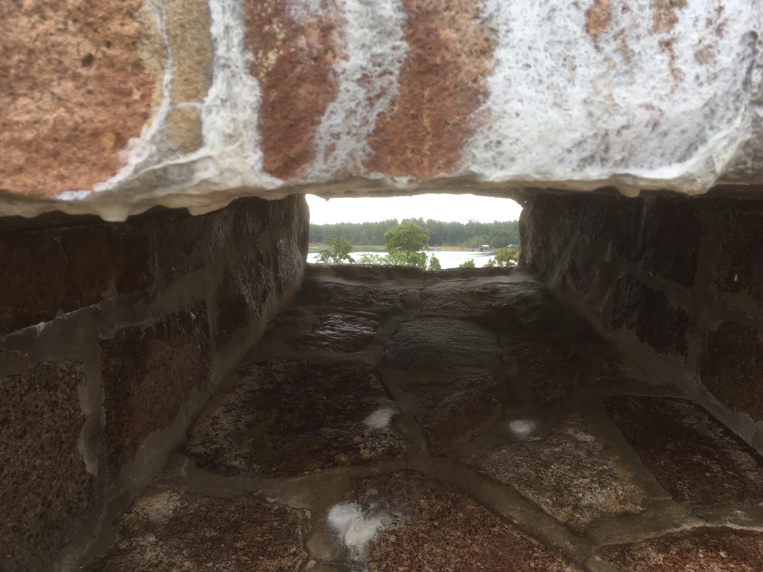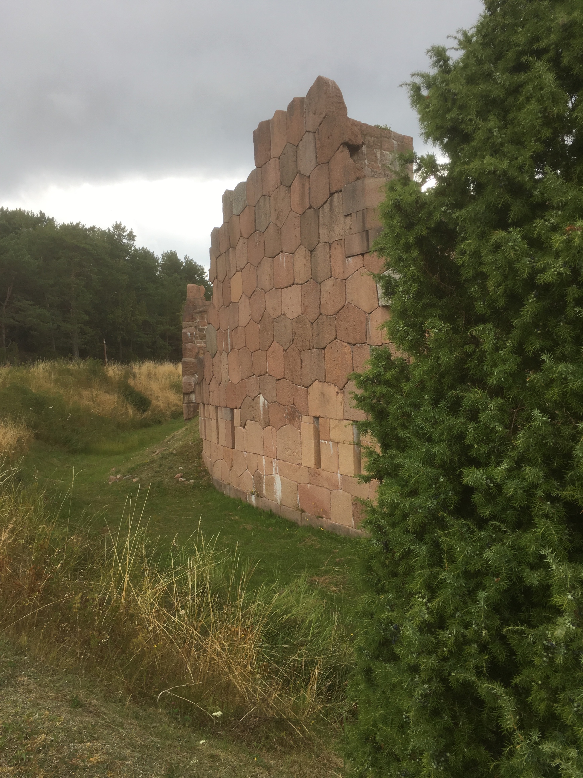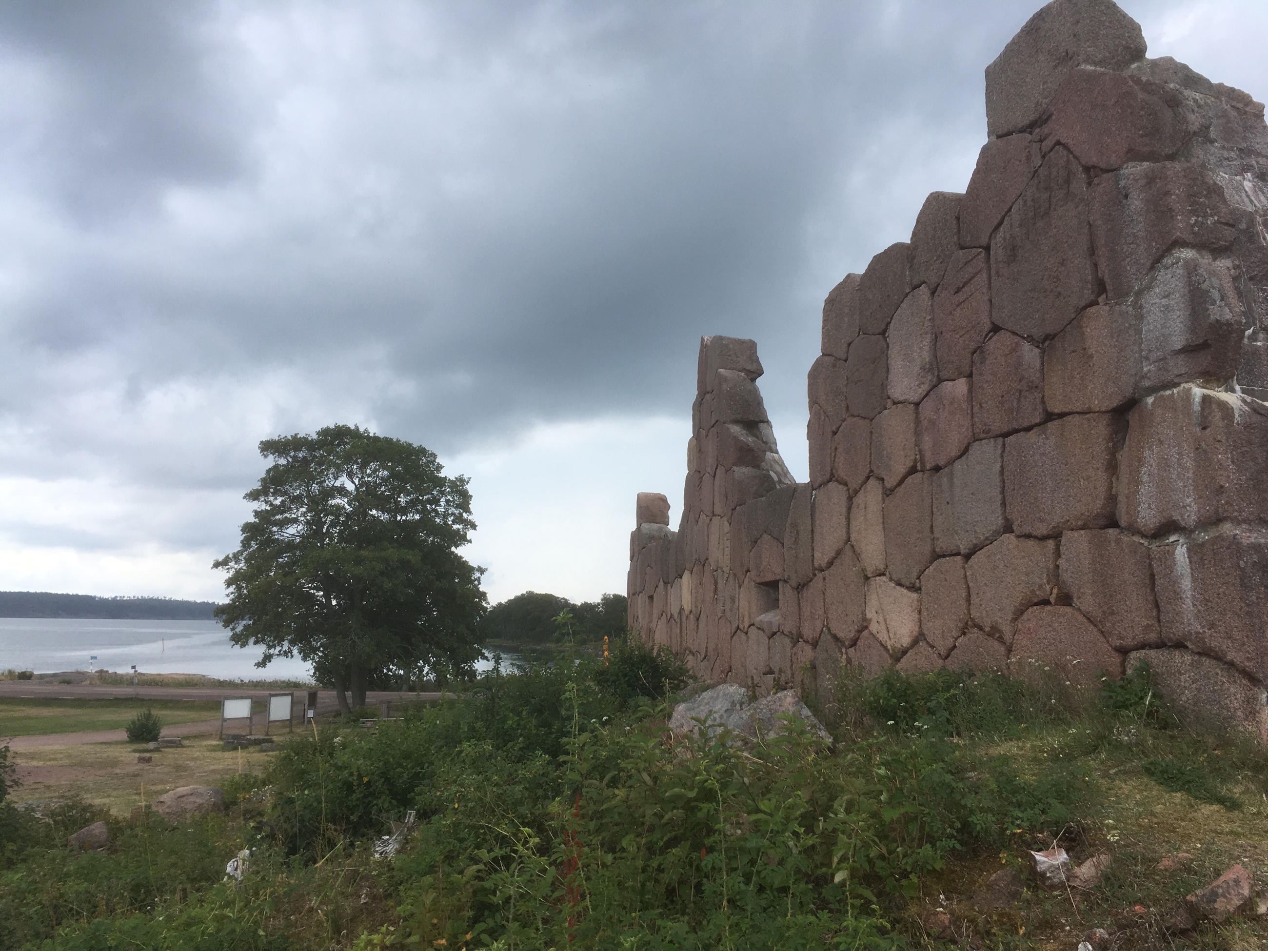 Efter en fika gjorde vi en historisk vandring bland ruinerna av den fästning som ryssarna började bygga år 1832 (efter att Sverige förlorat sin östra rikshalva till dem år 1809). Fästningen hann inte bli färdigbyggd innan Krimkriget bröt ut. Den 21 juni 1854 anfölls fästningen av en brittisk eskader. Ryssarna klarade av anfallet, men det följdes av flera. Den 8 augusti samma år landsteg britter och fransmän från en större flotta som ankrat upp utanför Bomarsund. Det är på dagen 165 år sedan… Den 16 augusti kapitulerade ryssarna. Sverige erbjöds att överta fästningen men avböjde. Därför sprängdes hela fästningen några dagar senare. Fullt utbyggd skulle fästningen vara nästan 300 meter lång och ha 2.500 man förlagda på platsen. Pga ett åskoväder som närmade sig gick vi tillbaka till båten. Exakt när vi klev ombord började regnet falla.