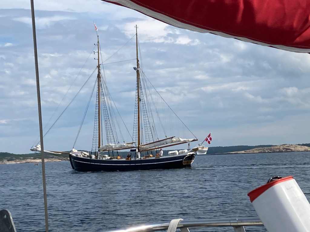 I morse var det fint väder när vi lämnade Sydkoster. Vinden var svag SO och minskade ytterligare till nära nog stiltje. Vi fick köra motor över hela Kosterfjorden. Sen ökade vinden, från V, och vi kunde segla in i skärgården mot Grebbestad.