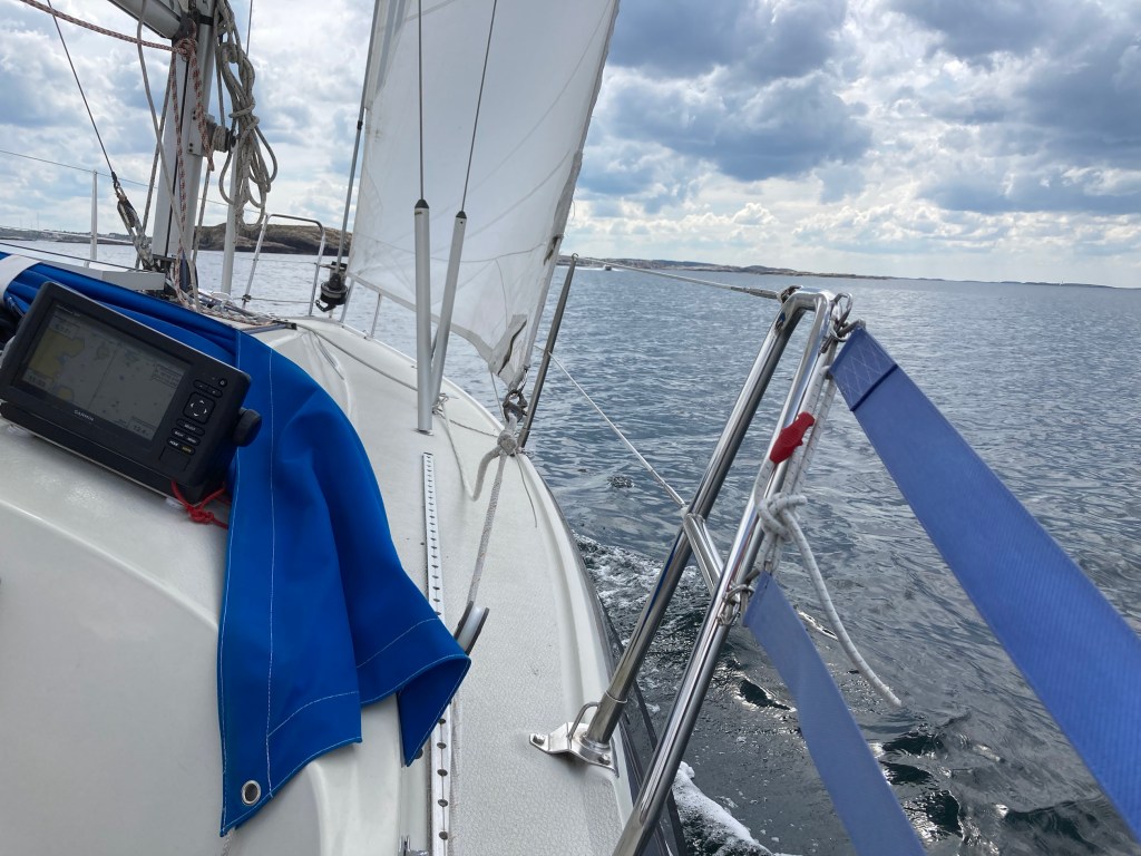 Efter frukost kom vi iväg klockan 10. Vi fick fin vind från sydväst som gav oss en härlig slör över till fastlandet. Det gick fortfarande en del dyning, men det blåste tillräckligt för att båten skulle gå behagligt stadigt i 5 – 6 knop.