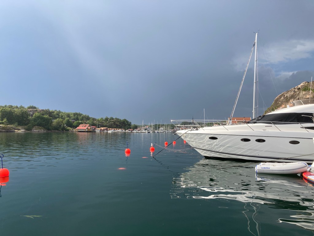 Ett par timmar efter landstigningen vid Grebbestad kom ett rejält oväder med stormbyar, blixt och dunder. Vi låg fint i lä men båten dansade iallafall in i bryggan. Det blev att styvhala bojlinan, så vi kom ut några decimeter från bryggan.