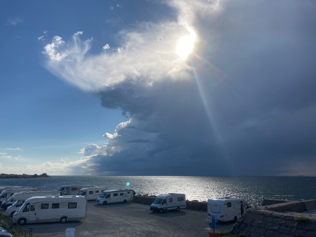 Lagom som maten var framdukad kom ett skyfall som heter duga. Regnet smattrade på vattnet så man fick höja rösten för att höra varandra. Mitt i ösregnet började det åska. En knall var värre än de andra – det var svårt att uppfatta om det hann gå någon sekund mellan blixt och knall. Den stora radar som finns 200 meter bort slutade snurra i en minut.
