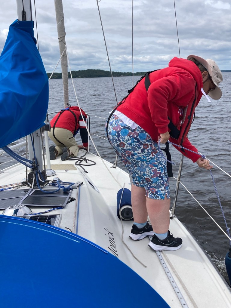 När vi i går skulle reva storen visade det sig att höljet på revlinan krackelerat. Det var inte lätt att dra linan genom blocken och linlåset. Som tur var kunde vi köpa en ny lina i Strängnäs gästhamn till kraftigt reducerat pris. Det blev lite plåster på såren…