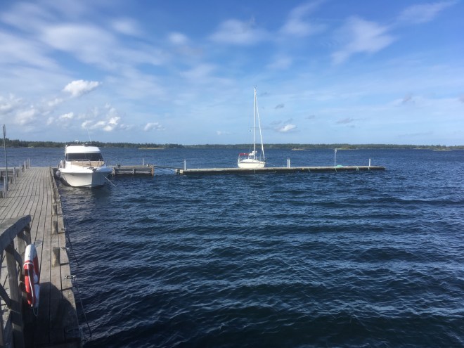 Vi seglade så fort i dag att det var för tidigt att stanna i Gräddö. Vi fortsatte istället till Fejan (igen!). Där var vi helt ensamma i dag. Vi gick till Kajak-fiket och käkade en våffla.