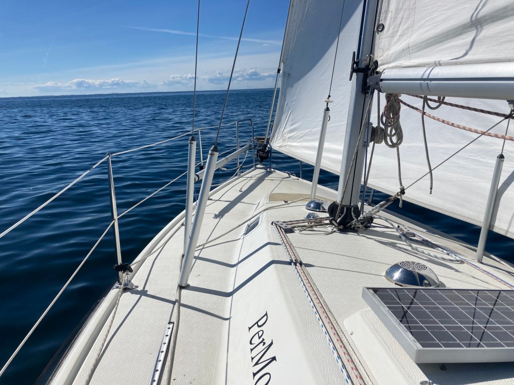 När farleden vek av mot norr blev det plattläns. Storen skotades så den inte tog någon vind. Genuan rullades ut på motsatta sidan mot gennakern och spirades maximalt.