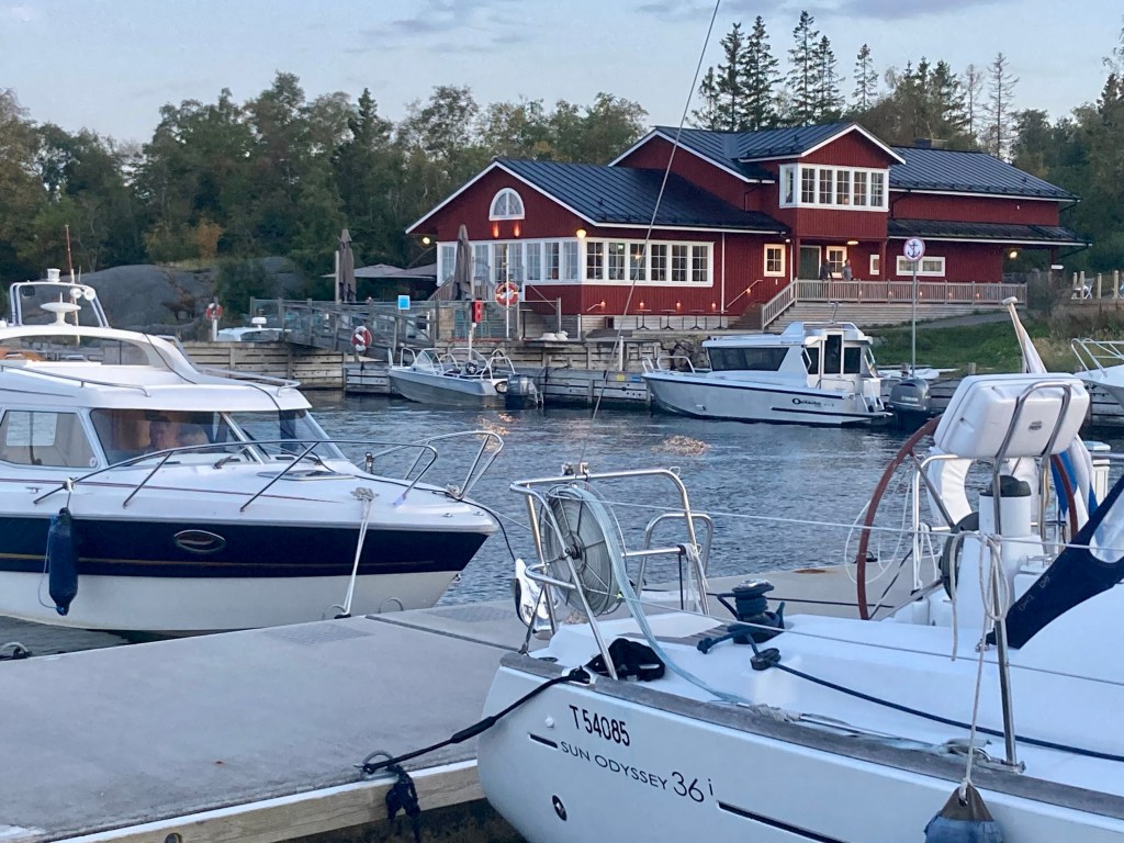 Fejan har systemet med moringlinor, vilket är lite jobbigt. Vi lyckades ”parkera” utan problem. När övriga i Sörmlsndseskadern kom hade hamnen fyllts med fler båtar. Det blev lite stökigt innan alla var på plats.