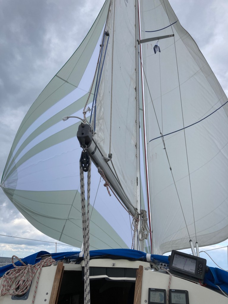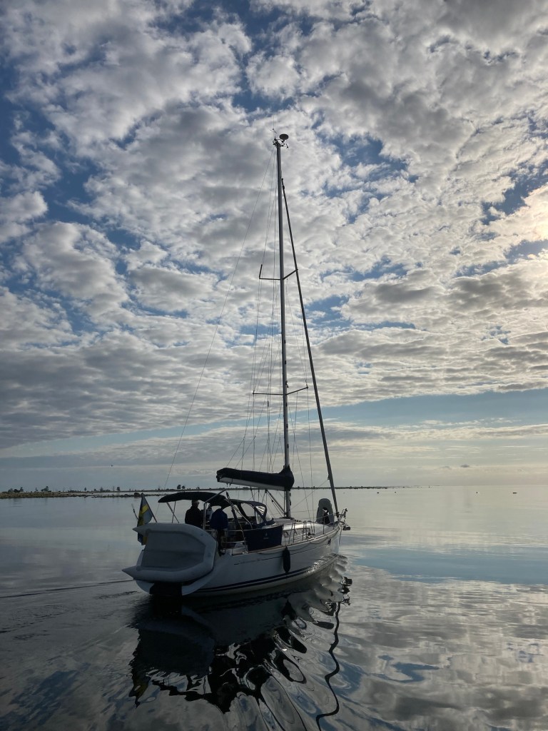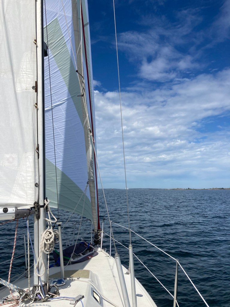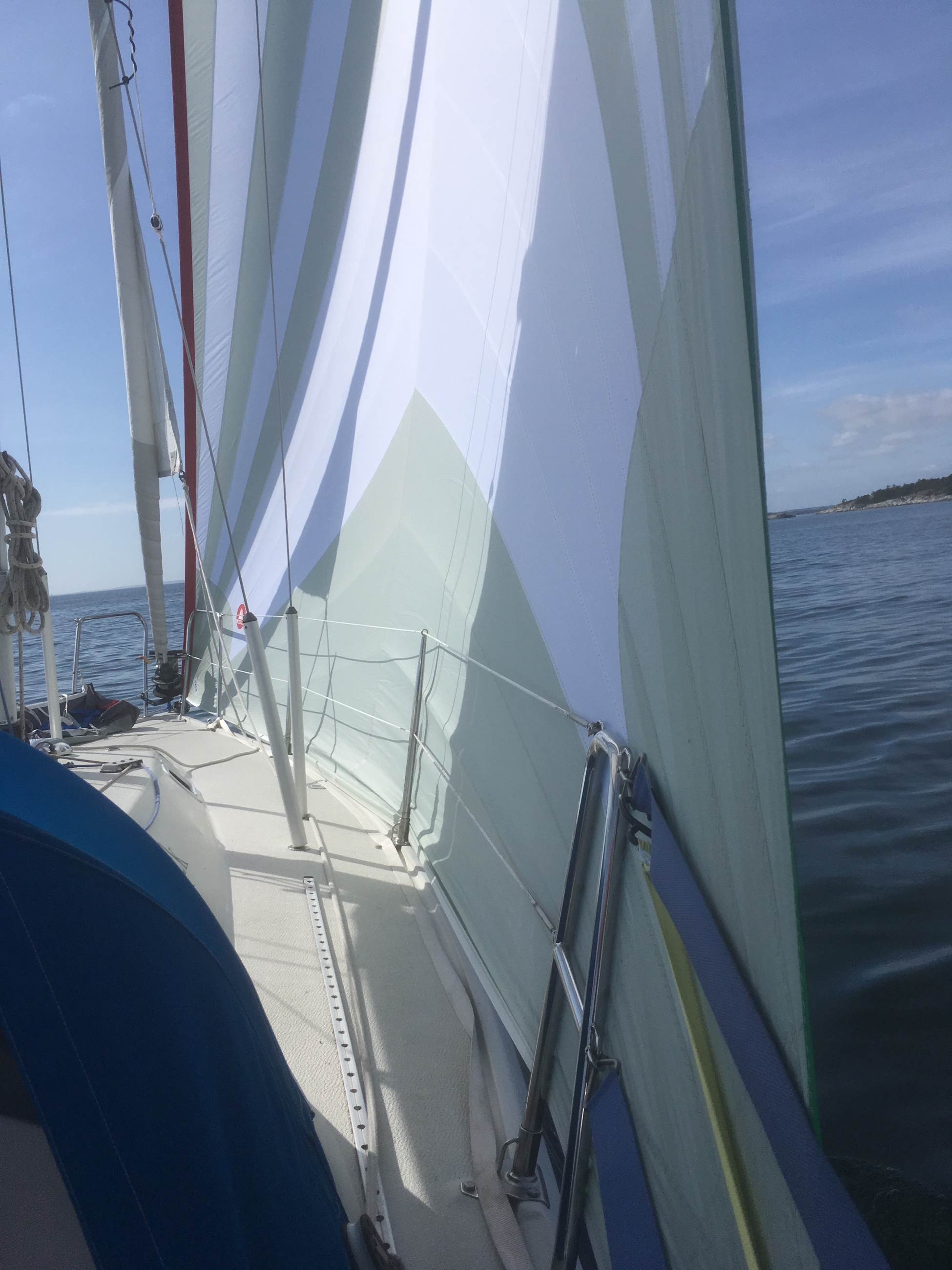 Vågorna minskade betydligt men vinden hade vridit emot. Vi körde motor en timme till. Vinden ökade men vred samtidigt till vår fördel så vi kunde rulla ut genuan och segla relativt bekvämt.