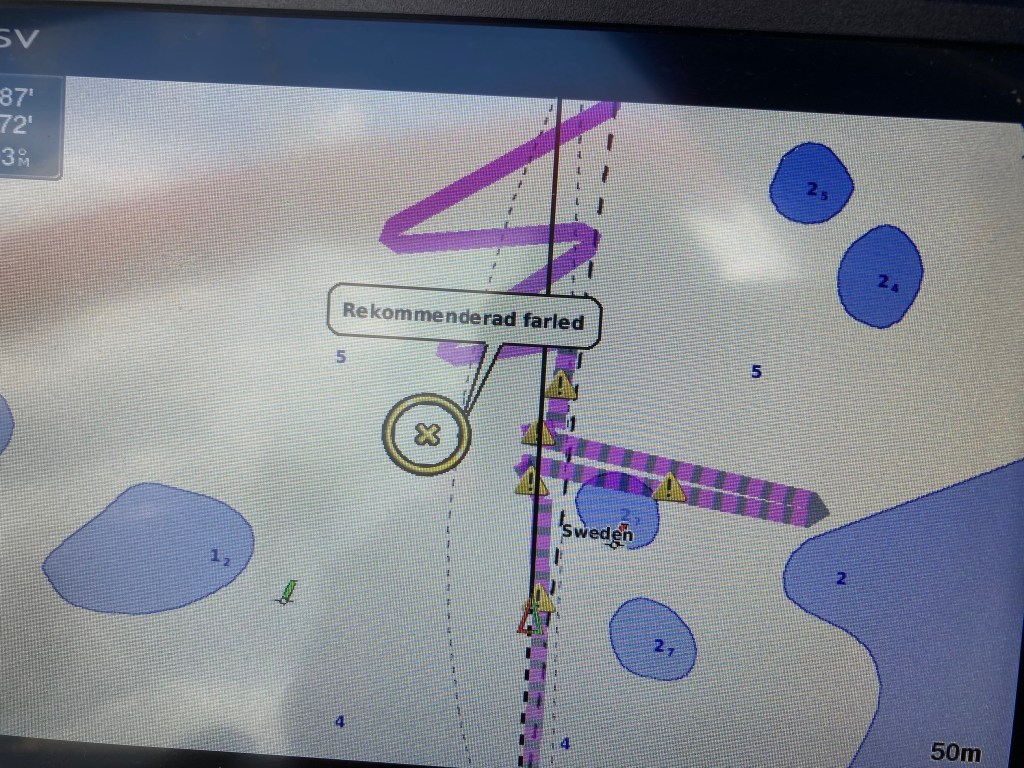 Vi rundade Sandhammarens långgrunda stränder ganska tajt denna gång. Det gick ingen dyning så vi behövde ingen marginal för den detaljen. På plottern ritade jag in en kurs som låg strax innanför 6-meterskurvan. Sträckan är ca 5 sjömil (nästan 1 landmil). Lodet visade 4,9 som grundast. I det läget skiftade vattnet färg, men vi såg aldrig sandbottnen.