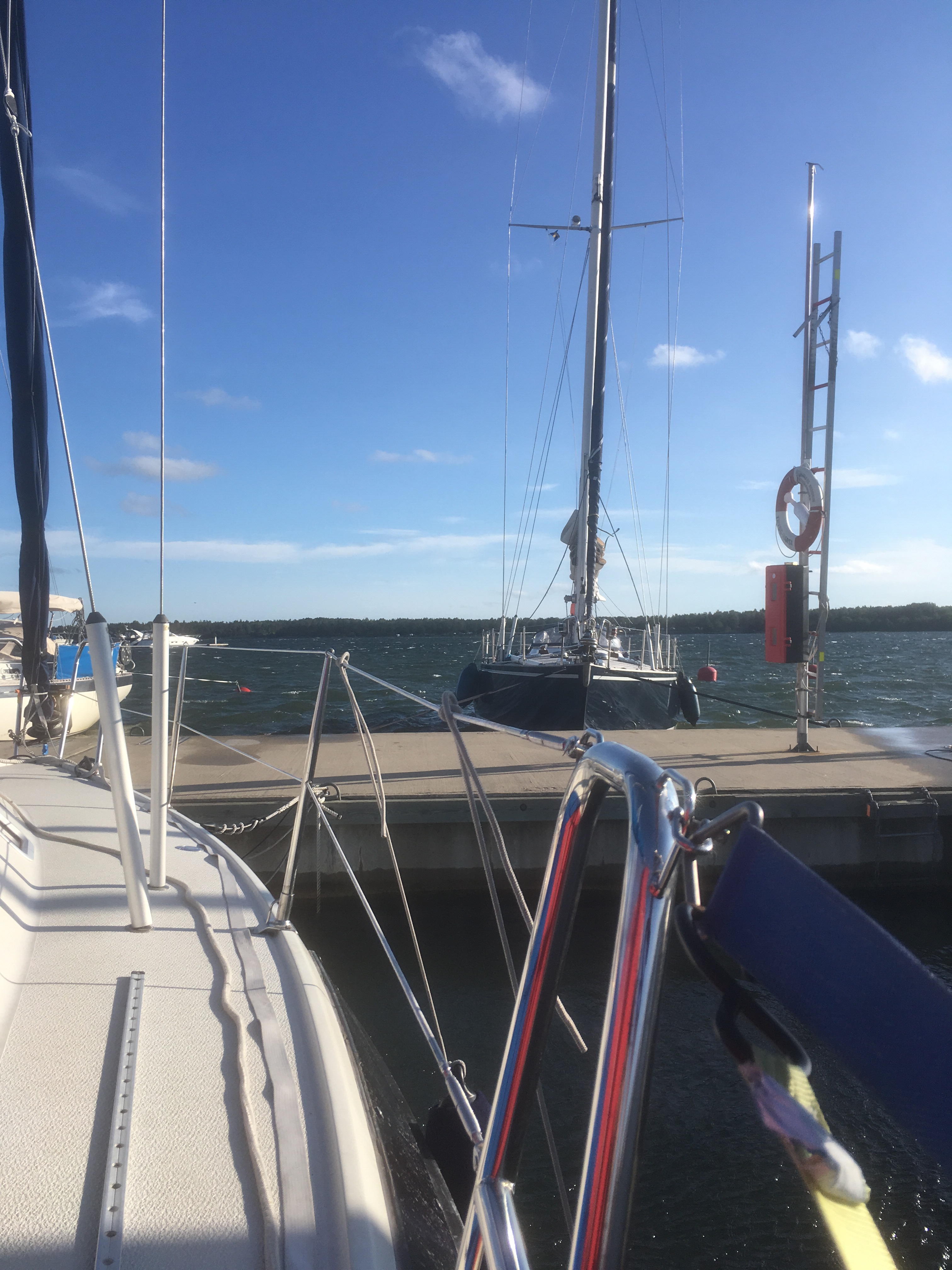 När vi skulle lägga till friskade vinden i, upp till 7 m/s. Vinden låg rätt på bryggan. Vi testade en ny arbetsfördelning för tilläggning med boj. Malte ansvarar för att hoppa (kliva) iland och förtöja. Monica styr med den friska handen. Per fäster bojkroken i bojen, sköter ”gaspedalen” samt styr den sista metern in till bryggan. Det fungerade galant redan vid premiären!
