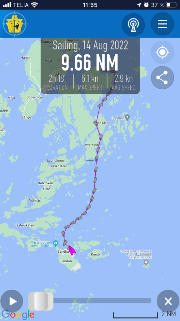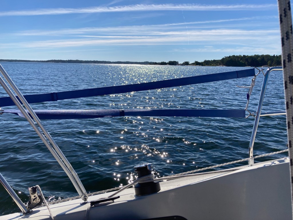 Vi fick plattläns över Krabbfjärden och ända fram till Sävsundet. Där knöt vi ihop ”öglan” på årets segling. Den 18 juni passerade Monica, Christer B och jag samma plats, norrgående, och girade upp mot Södertälje.