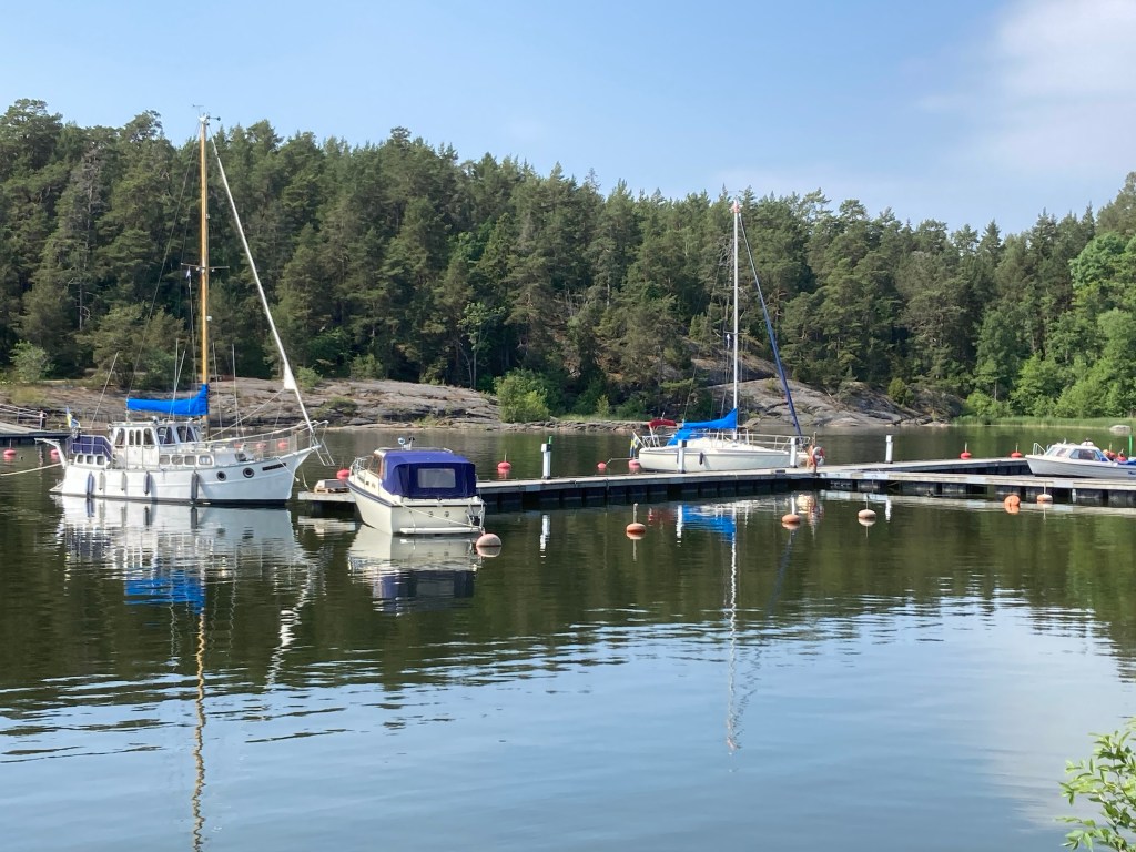 När detta skrivs (kl 21) ligger vi fyra gästbåtar vid bryggorna, plus en snål typ som lagts sig på svaj i viken.