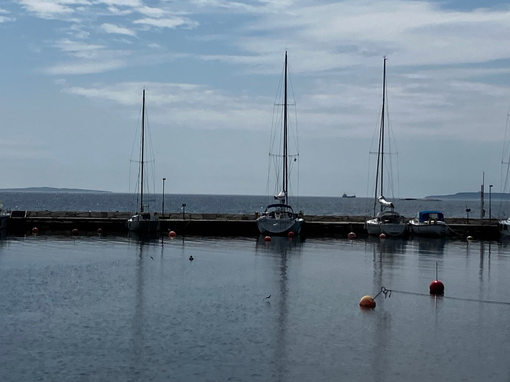 Vinden är frisk i hamnen. 6 m/s med byar upp till 14. Men solen skiner och det är lagom varmt.