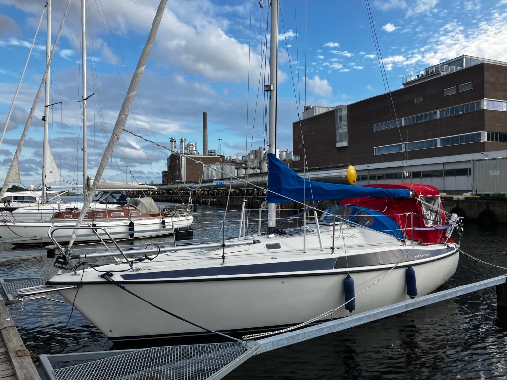 Vi har legat kvar några dagar i Karlshamns centrala gästhamn. Den här gången ligger det fler båtar här. En tjusig Vindö 40 (siffran är inte antal fot utan antal kvadratmeter segel) ligger bredvid oss. Hemmahamn Halmstad. Det är den näst största Vindö-varianten som byggdes. Båten byggdes år 1979, d v s årsbarn med PerMonick.