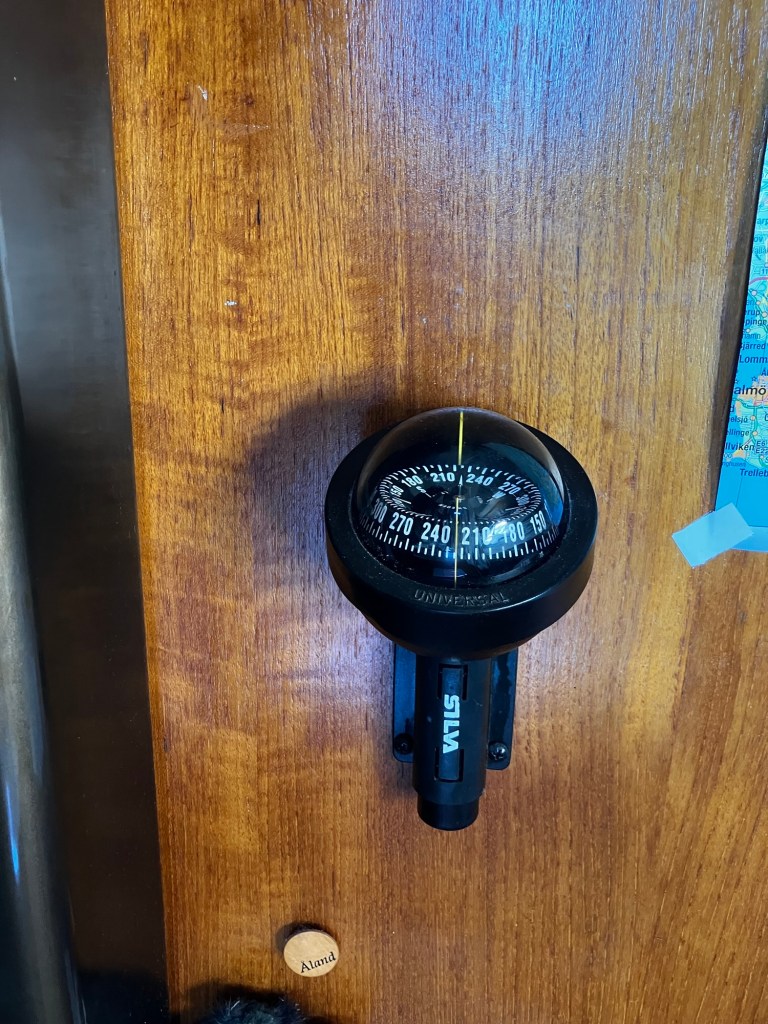 I sittbrunnen har vi en fast monterad kompass, som borde bytas ut. Inne i ruffen har vi en reservkompass som kan tas ur fästet. Det är dessutom en syftkompass, vilket gör att man ganska enkelt kan ta ut riktningen till två eller flera kända objekt och därmed i sjökortet kunna plotta var man befinner sig. Det borde man träna på några gånger per säsong, men i verkligheten har jag gjort det kanske var femte år…