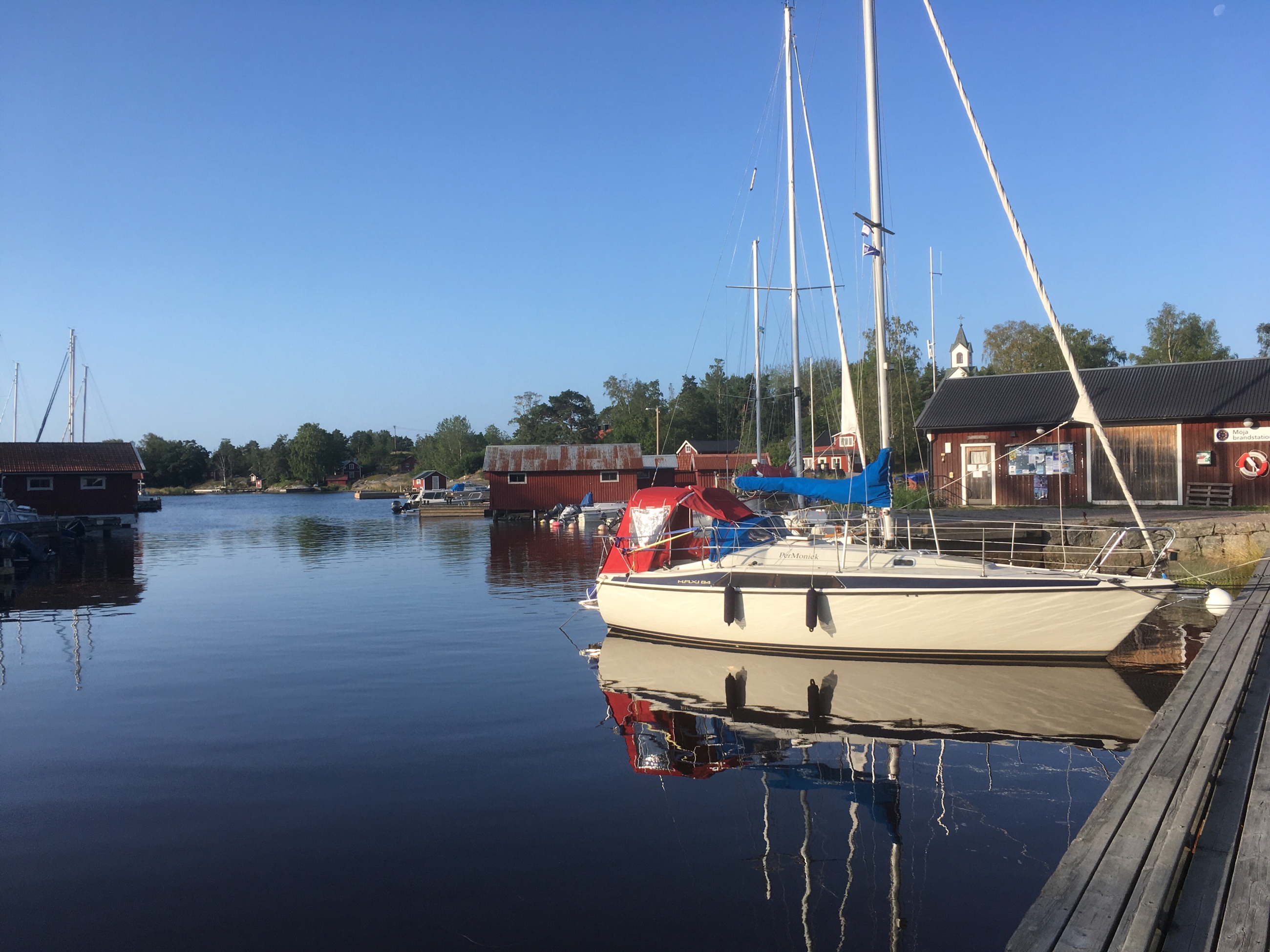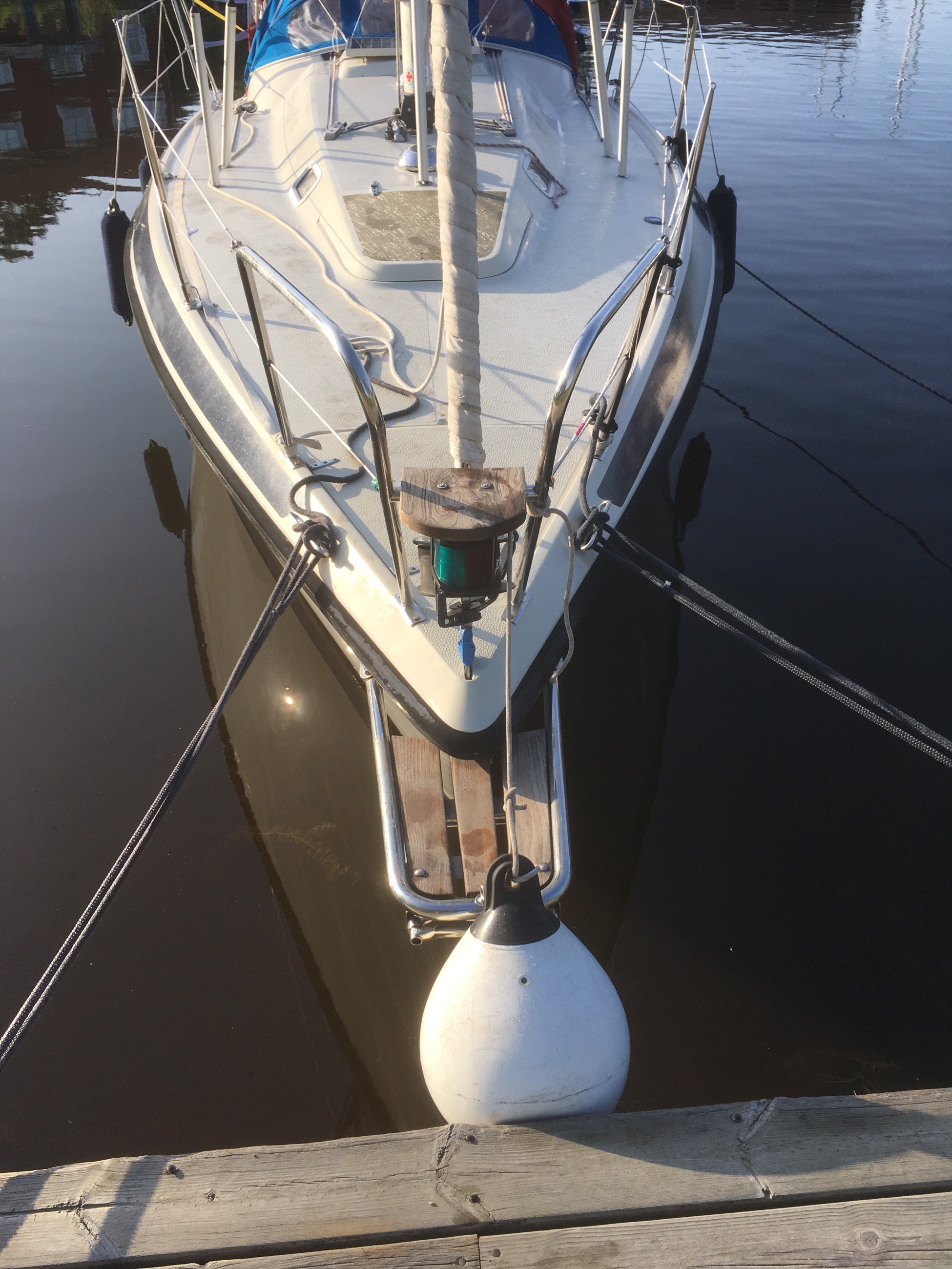 I natt har vi kört med ”Waxholms-förtöjning” för att avlasta ankaret. Vi har extremt kort ankarlina ute (pga trång hamn), så man kan inte lita på ankarfästet. Men med båten tryckt mot bryggan, med kulfendern emellan och akterspring håller oss på plats.