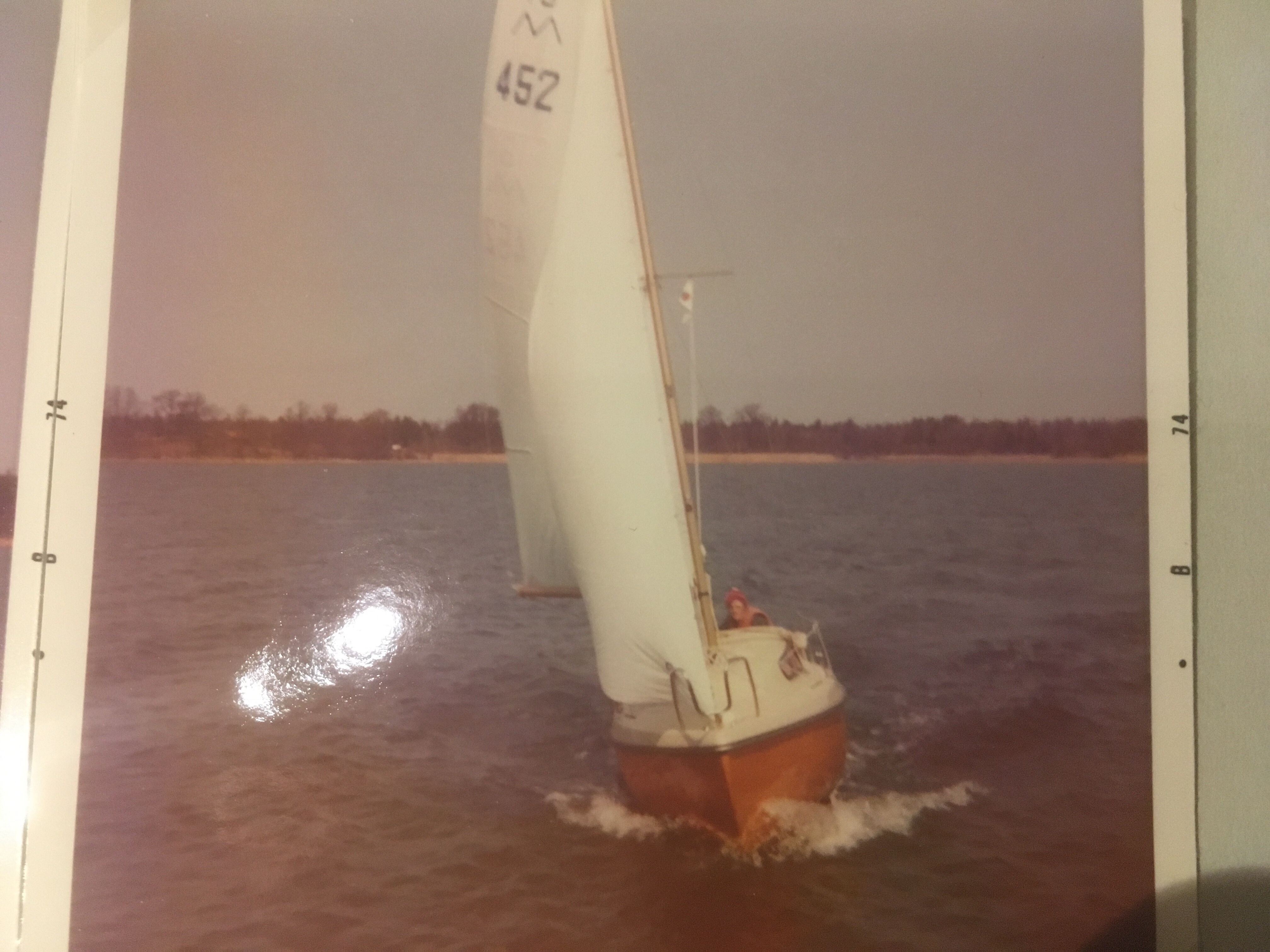 År 1968 fick jag min första ”riktiga” segelbåt. Moth-jollen. En centerbordsbåt av marinplywood. Jag hade båten i tre år. En enda gång kantrade jag med båten – det blåste friskt. Men jag lyckades väga upp båten genom att ställa mig på centerbordet , som jag lärt mig på OXSS seglarskola. Och det var ju bra eftersom det inte fanns några vattentäta skott eller andra flytmedel i båten.
