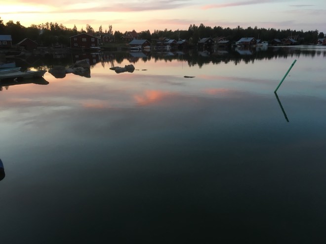 Vi fick återigen en lugn kväll och natt. Vattentemperaturen som i Sundsvall var kring 20 grader har nu ramlat ner till 15. Under natten var det strax över 10 grader i luften. Värmaren fixar dock att det blir en lagom temp inne i båten.