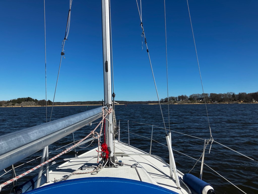 Sen tog jag motorn till hjälp ut ur viken. Väl ute kunde jag rulla ut genuan och segla till Hasselö-Bergö där jag turligt nog hittade en ledig SXK-boj.