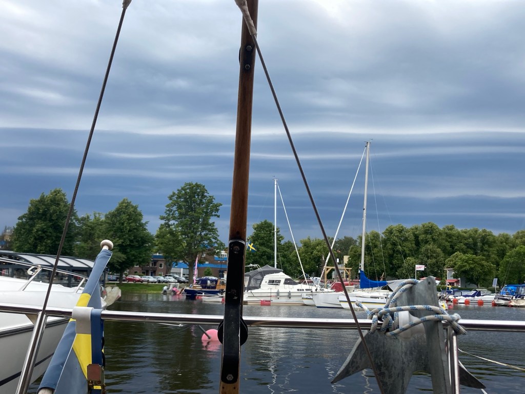 Efter frukost började vi göra oss klara för avfärd från Strängnäs. Då lämnade en skapligt stor, modern, motorbåt kajen och backade ut. Motorbåten drev pga vinden sidledes, träffade den boj som vi och ytterligare en segelbåt var förtöjda i. Motorbåtens akter fastnade i vår bojkrok och med en kraftig smäll slets förtöjningsbandet (typ Ankarolina) av. Därmed hade vi ingen akterförtöjning och båten drev in i kajen och väldigt nära vår motorbåtsgranne (modell Cigarette). Vi blev fullt upptagna med att hålla ut PerMonick från kaj och båtgranne och få över en lina till Cigaretten, så vi låg still. Samtidigt försvann den stora motorbåten, som orsakade det hela, utom synhåll.